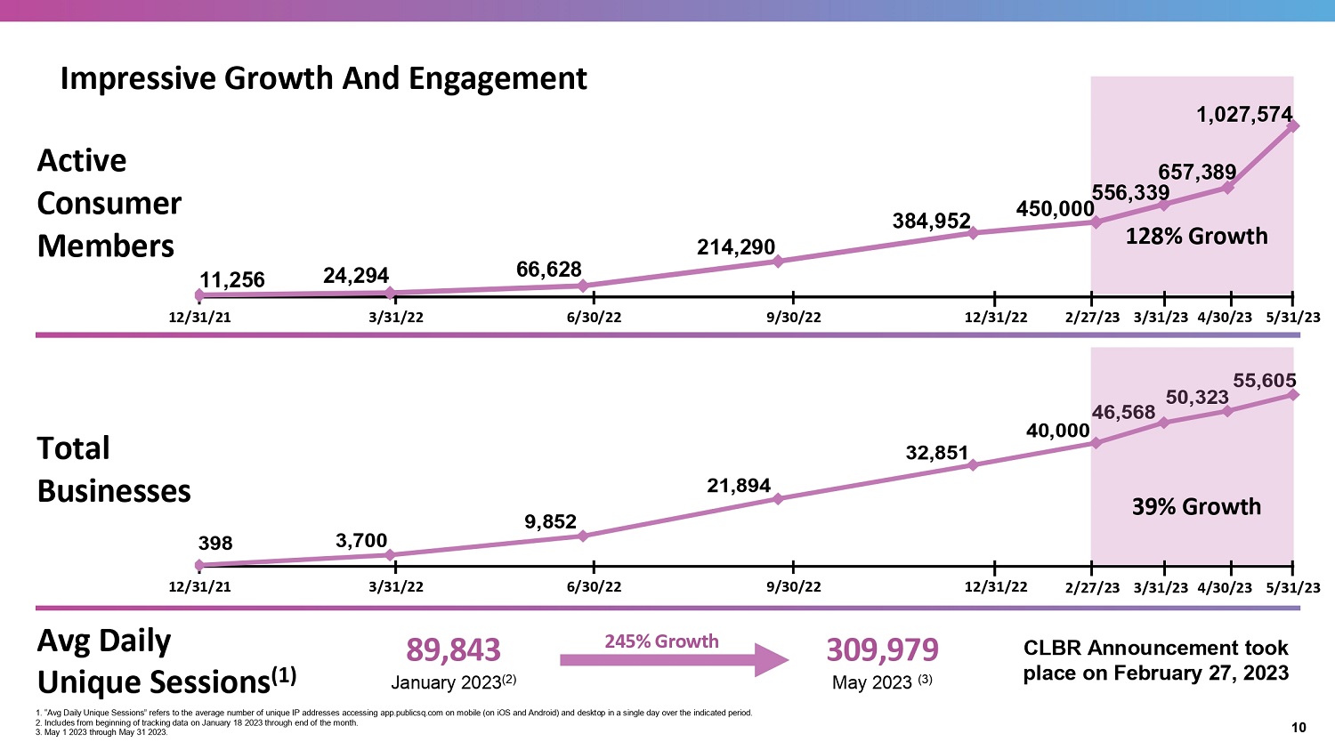 Impressive Growth And Engagement Active Con s u m er Members Total Bu s i n e s s e s Avg Daily Unique Sessions (1) 89,843 January 2023 (2) 309,979 May 2023 (3) 1. “Avg Daily Unique Sessions” refers to the average number of unique IP addresses accessing app.publicsq.com on mobile (on iOS and Android) and desktop in a single day over the indicated period. 2. Includes from beginning of tracking data on January 18 2023 through end of the month. 3. May 1 2023 through May 31 2023. 245 % G r o wt h 128% Growth CLBR Announcement took place on February 27, 2023 12/31/21 3/31/22 6/30/22 9/30/22 12/31/22 2/27/2 3 3/31/2 3 4/30/2 3 5/31/23 12/31/21 3/31/22 6/30/22 9/30/22 12/31/22 11 ,2 5 6 24 ,2 9 4 66 ,6 2 8 2 14,2 90 3 84,9 52 450 ,0 0 0 5 56,3 39 6 57,3 89 1,0 2 7 ,5 7 4 3 9 8 3, 7 00 9, 8 52 2 1 ,8 9 4 32 ,8 5 1 4 0 ,0 0 0 4 6 ,5 6 8 5 0 ,3 2 3 5 5 ,6 0 5 39% Growth 2/27/2 3 3/31/2 3 4/30/2 3 5/31/23 10