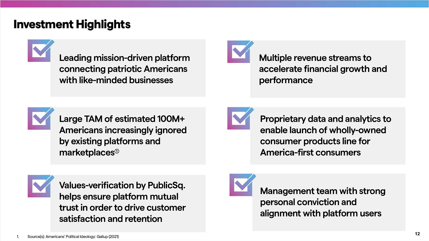 L e adin g mission - dri v e n pl a t f orm conne c tin g p a tri o ti c Ameri c ans wi t h li k e - minde d busin e s s e s 1. Source(s): Americans’ Political Ideology: Gallup (2021) I n v e s tme n t Highlig h t s La r g e T A M o f e s tim a t e d 100M+ Ameri c an s inc r e asingl y igno r ed b y e x i s t i n g p l a t f o r m s an d marketplaces ᕭ Values - verification by PublicSq. hel p s ensu r e pl a t f or m m u t ual t r u s t i n o r de r t o dri v e cu s t omer s a ti s f a c tio n an d r e t e n tion Multipl e r e v e n u e s t r e am s t o accele r a te financia l g r o w t h and performance P r opri e t ar y d a t a an d analyti c s t o enable launch of wholly - owned consume r p r odu c t s lin e f or Ameri c a - fi r s t consume r s Manageme n t t e a m wi t h s t r ong pe r s ona l co n vi c tio n and alignme n t wi t h pl a t f or m u s e r s 12