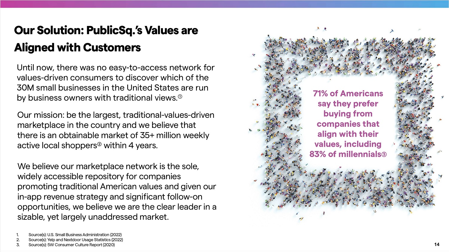 Until now, there was no easy - to - access network for values - driven consumers to discover which of the 30M small businesses in the United States are run by business owners with traditional views. ᕭ Our mission: be the largest, traditional - values - driven marketplace in the country and we believe that there is an obtainable market of 35+ million weekly active local shoppers ˚ within 4 years. 1. Source(s): U.S. Small Business Administration (2022) 2. Source(s): Yelp and Nextdoor Usage Statistics (2022) 3. Sou r ce(s) : 5 W Consume r C ul tu r e R epo r t (2020) 7 1% o f Ameri c ans say they prefer buying from companies that align with their values, including 8 3% o f millennials ¤ We believe our marketplace network is the sole, widely accessible repository for companies promoting traditional American values and given our in - app revenue strategy and significant follow - on oppo r tunities, we believe we are the clear leader in a sizable, yet largely unaddressed market. Ou r Solution : P ublicSq. ’ s V alu e s a r e Aligne d wi t h C u s t ome r s 14