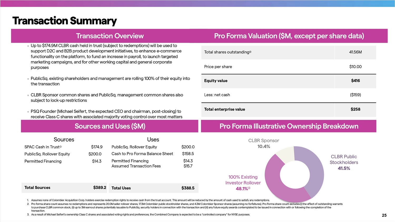 41.56M Total shares outstanding ˚ $10.00 Price per share $416 Equity value ($159) Less: net cash $258 Total enterprise value 1. Assumes none of Colombier Acquisition Corp. holders exercise redemption rights to receive cash from the trust account. This amount will be reduced by the amount of cash used to satisfy any redemptions. 2. Pro forma share count assumes no redemptions and represents 20.0M seller rollover shares, 17.3M Colombier public stockholder shares, and 4.3M Colombier Sponsor shares (assuming no forfeitures). Pro Forma share count excludes (i) the effect of outstanding warrants to purchase CLBR common stock, (ii) up to 3M earnout shares potentially issuable to PublicSq. security holders in connection with the transaction and (iii) any future equity awards contemplated to be issued in connection with or following the completion of the transaction. 3. As a result of Michael Seife r t’s ownership Class C shares and associated voting rights and preferences, the Combined Company is expected to be a “controlled company” for NYSE purposes. ▪ Up to $174.9M CLBR cash held in trust (subject to redemptions) will be used to suppo r t D2C and B2B product development initiatives, to enhance e - commerce functionality on the platform, to fund an increase in payroll, to launch targeted marketing campaigns, and for other working capital and general corporate purposes ▪ PublicSq. existing shareholders and management are rolling 100% of their equity into the transaction ▪ CLBR Sponsor common shares and PublicSq. management common shares also subject to lock - up restrictions ▪ PSQ Founder (Michael Seife r t, the expected CEO and chairman, post - closing) to receive Class C shares with associated majority voting control over most matters submit t e d f o r s t ockholde r app r o v al. Total Sources $389.2 Total Uses $388.5 100% Exi s ting I n v e s tor R o ll o v e r 48.1% ˛ CLBR Public S t o c k h o l d e r s 41.5% CLBR Sponsor 10.4% $200.0 Uses PublicSq. Rollover Equity $174.9 Sources SPAC Cash in Trust ᕭ $158.5 Cash to Pro Forma Balance Sheet $200.0 PublicSq. Rollover Equity $14.3 Permitted Financing $14.3 Permitted Financing $15.7 Assumed Transaction Fees T r a n s a c t i o n S u mm a r y 25 T r an s a c t i o n O v e r v i e w P r o F orm a V alu a tio n ($M , e x ce p t pe r sha r e d a t a) Sou r c e s an d U s e s ($M) Pro Forma Illustrative Ownership Breakdown