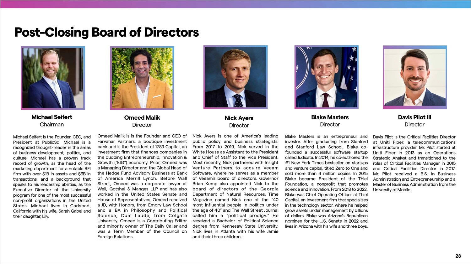 P o s t - C l o s i n g B o a r d o f D i r e c t o r s Bla k e Ma s t e r s Director Blake Masters is an entrepreneur and investor . After graduating from Stanford and Stanford Law School, Blake co - founded a successful software sta r tup called Judicata . In 2014 , he co - authored the # 1 New York Times bestseller on sta r tups and venture capital, titled Zero to One and sold more than 4 million copies . In 2015 Blake became President of the Thiel Foundation, a nonprofit that promotes s c i e n ce a n d i nn o v a t i o n . F r o m 2 0 1 8 t o 2 0 22 , Blake was Chief Operating Officer at Thiel Capital, an investment firm that specializes in the technology sector, where he helped grow assets under management by billions of dollars . Blake was Arizona’s Republican nominee for the U . S . Senate in 2022 and li v e s i n Ari z on a wi t h hi s wi f e an d t h r e e b o y s . Michae l Sei f e r t Chairman Michael Seife r t is the Founder, CEO, and President at PublicSq . Michael is a recognized thought - leader in the areas of business development, politics, and culture . Michael has a proven track record of growth, as the head of the marketing depa r tment for a notable REI firm with over $ 1 B in assets and $ 3 B in transactions, and a background that speaks to his leadership abilities, as the Executive Director of the University program for one of the most successful non - profit organizations in the United States . Michael lives in Carlsbad, California with his wife, Sarah Gabel and t h e i r d a u g ht e r , L i l y . Omee d Malik Director Omeed Malik is is the Founder and CEO of Farvahar Pa r tners, a boutique investment bank and is the President of 1789 Capital, an investment firm that finances companies in the budding Entrepreneurship, Innovation & Growth ("EIG") economy. Prior, Omeed was a Managing Director and the Global Head of the Hedge Fund Advisory Business at Bank of America Merrill Lynch. Before Wall Street, Omeed was a corporate lawyer at Weil, Gotshal & Manges LLP and has also worked in the United States Senate and House of Representatives. Omeed received a JD, with Honors, from Emory Law School and a BA in Philosophy and Political Science, Cum Laude, from Colgate University. Omeed is a Contributing Editor and minority owner of The Daily Caller and was a Term Member of the Council on Foreign Relations. Nic k Ay e r s Director Nick Ayers is one of America’s leading public policy and business strategists . From 2017 to 2019 , Nick served in the White House as Assistant to the President and Chief of Staff to the Vice President . Most recently, Nick pa r tnered with Insight Venture Pa r tners to acquire Veeam Software, where he serves as a member of Veeam’s board of directors . Governor Brian Kemp also appointed Nick to the board of directors of the Georgia Depa r tment of Natural Resources . Time Magazine named Nick one of the “ 40 most influential people in politics under the age of 40 ” and The Wall Street Journal called him a “political prodigy . ” He received a Bachelor of Political Science degree from Kennesaw State University . Nick lives in Atlanta with his wife Jamie and their three children . D a vi s Pil o t III Director Davis Pilot is the Critical Facilities Director at Uniti Fiber, a telecommunications infrastructure provider . Mr . Pilot sta r ted at Uniti Fiber in 2013 as an Operations Strategic Analyst and transitioned to the roles of Critical Facilities Manager in 2015 and Critical Facilities Director in 2017 . Mr . Pilot received a B . S . in Business Administration and Entrepreneurship and a Ma st e r o f Busin e s s A dmini st r a tio n f r o m the Uni v e r sit y o f Mobil e . 28