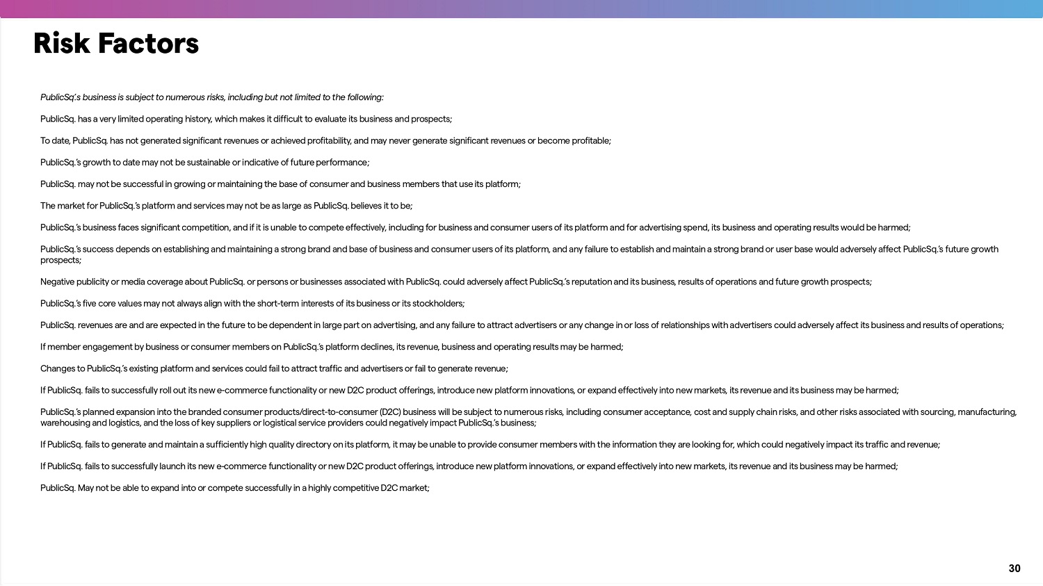 Risk F ac t o r s 30 PublicSq’.s business is subject to numerous risks, including but not limited to the following: PublicSq. has a very limited operating history, which makes it difficult to evaluate its business and prospects; To date, PublicSq. has not generated significant revenues or achieved profitability, and may never generate significant revenues or become profitable; PublicSq.’s growth to date may not be sustainable or indicative of future performance; PublicSq. may not be successful in growing or maintaining the base of consumer and business members that use its platform; The market for PublicSq.’s platform and services may not be as large as PublicSq. believes it to be; PublicSq.’s business faces significant competition, and if it is unable to compete effectively, including for business and consumer users of its platform and for adve r tising spend, its business and operating results would be harmed; PublicSq.’s success depends on establishing and maintaining a strong brand and base of business and consumer users of its platform, and any failure to establish and maintain a strong brand or user base would adversely affect PublicSq.’s future growth prospects; Negative publicity or media coverage about PublicSq. or persons or businesses associated with PublicSq. could adversely affect PublicSq.’s reputation and its business, results of operations and future growth prospects; PublicSq.’s five core values may not always align with the sho r t - term interests of its business or its stockholders; PublicSq. revenues are and are expected in the future to be dependent in large pa r t on adve r tising, and any failure to attract adve r tisers or any change in or loss of relationships with adve r tisers could adversely affect its business and results of operations; If member engagement by business or consumer members on PublicSq.’s platform declines, its revenue, business and operating results may be harmed; Changes to PublicSq.’s existing platform and services could fail to attract traffic and adve r tisers or fail to generate revenue; If PublicSq. fails to successfully roll out its new e - commerce functionality or new D2C product offerings, introduce new platform innovations, or expand effectively into new markets, its revenue and its business may be harmed; PublicSq.’s planned expansion into the branded consumer products/direct - to - consumer (D2C) business will be subject to numerous risks, including consumer acceptance, cost and supply chain risks, and other risks associated with sourcing, manufacturing, warehousing and logistics, and the loss of key suppliers or logistical service providers could negatively impact PublicSq.’s business; If PublicSq. fails to generate and maintain a sufficiently high quality directory on its platform, it may be unable to provide consumer members with the information they are looking for, which could negatively impact its traffic and revenue; If PublicSq. fails to successfully launch its new e - commerce functionality or new D2C product offerings, introduce new platform innovations, or expand effectively into new markets, its revenue and its business may be harmed; PublicSq. May not be able to expand into or compete successfully in a highly competitive D2C market;