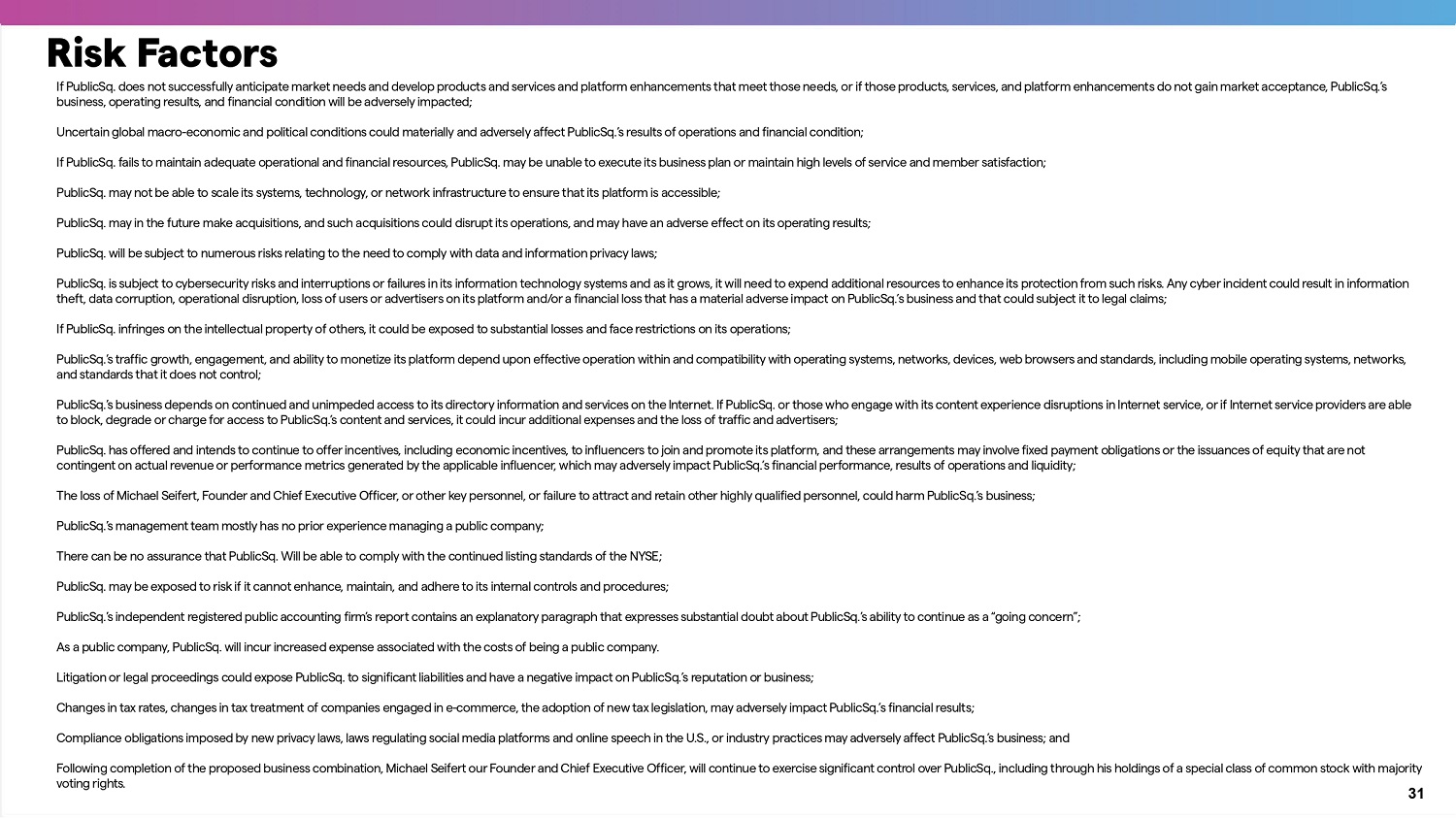 31 Unce r tain global macro - economic and political conditions could materially and adversely affect PublicSq.’s results of operations and financial condition; If PublicSq. fails to maintain adequate operational and financial resources, PublicSq. may be unable to execute its business plan or maintain high levels of service and member satisfaction; PublicSq. may not be able to scale its systems, technology, or network infrastructure to ensure that its platform is accessible; PublicSq. may in the future make acquisitions, and such acquisitions could disrupt its operations, and may have an adverse effect on its operating results; PublicSq. will be subject to numerous risks relating to the need to comply with data and information privacy laws; PublicSq. is subject to cybersecurity risks and interruptions or failures in its information technology systems and as it grows, it will need to expend additional resources to enhance its protection from such risks. Any cyber incident could result in information theft, data corruption, operational disruption, loss of users or adve r tisers on its platform and/or a financial loss that has a material adverse impact on PublicSq.’s business and that could subject it to legal claims; If PublicSq. infringes on the intellectual prope r ty of others, it could be exposed to substantial losses and face restrictions on its operations; PublicSq.’s traffic growth, engagement, and ability to monetize its platform depend upon effective operation within and compatibility with operating systems, networks, devices, web browsers and standards, including mobile operating systems, networks, and standards that it does not control; PublicSq.’s business depends on continued and unimpeded access to its directory information and services on the Internet. If PublicSq. or those who engage with its content experience disruptions in Internet service, or if Internet service providers are able to block, degrade or charge for access to PublicSq.’s content and services, it could incur additional expenses and the loss of traffic and adve r tisers; PublicSq. has offered and intends to continue to offer incentives, including economic incentives, to influencers to join and promote its platform, and these arrangements may involve fixed payment obligations or the issuances of equity that are not contingent on actual revenue or performance metrics generated by the applicable influencer, which may adversely impact PublicSq.’s financial performance, results of operations and liquidity; The loss of Michael Seife r t, Founder and Chief Executive Officer, or other key personnel, or failure to attract and retain other highly qualified personnel, could harm PublicSq.’s business; PublicSq.’s management team mostly has no prior experience managing a public company; There can be no assurance that PublicSq. Will be able to comply with the continued listing standards of the NYSE; PublicSq. may be exposed to risk if it cannot enhance, maintain, and adhere to its internal controls and procedures; PublicSq.’s independent registered public accounting firm’s repo r t contains an explanatory paragraph that expresses substantial doubt about PublicSq.’s ability to continue as a “going concern”; As a public company, PublicSq. will incur increased expense associated with the costs of being a public company. Litigation or legal proceedings could expose PublicSq. to significant liabilities and have a negative impact on PublicSq.’s reputation or business; Changes in tax rates, changes in tax treatment of companies engaged in e - commerce, the adoption of new tax legislation, may adversely impact PublicSq.’s financial results; Compliance obligations imposed by new privacy laws, laws regulating social media platforms and online speech in the U.S., or industry practices may adversely affect PublicSq.’s business; and Following completion of the proposed business combination, Michael Seife r t our Founder and Chief Executive Officer, will continue to exercise significant control over PublicSq., including through his holdings of a special class of common stock with majority v o t i n g r i g h t s . Risk F ac t o r s If PublicSq. does not successfully anticipate market needs and develop products and services and platform enhancements that meet those needs, or if those products, services, and platform enhancements do not gain market acceptance, PublicSq.’s business, operating results, and financial condition will be adversely impacted;