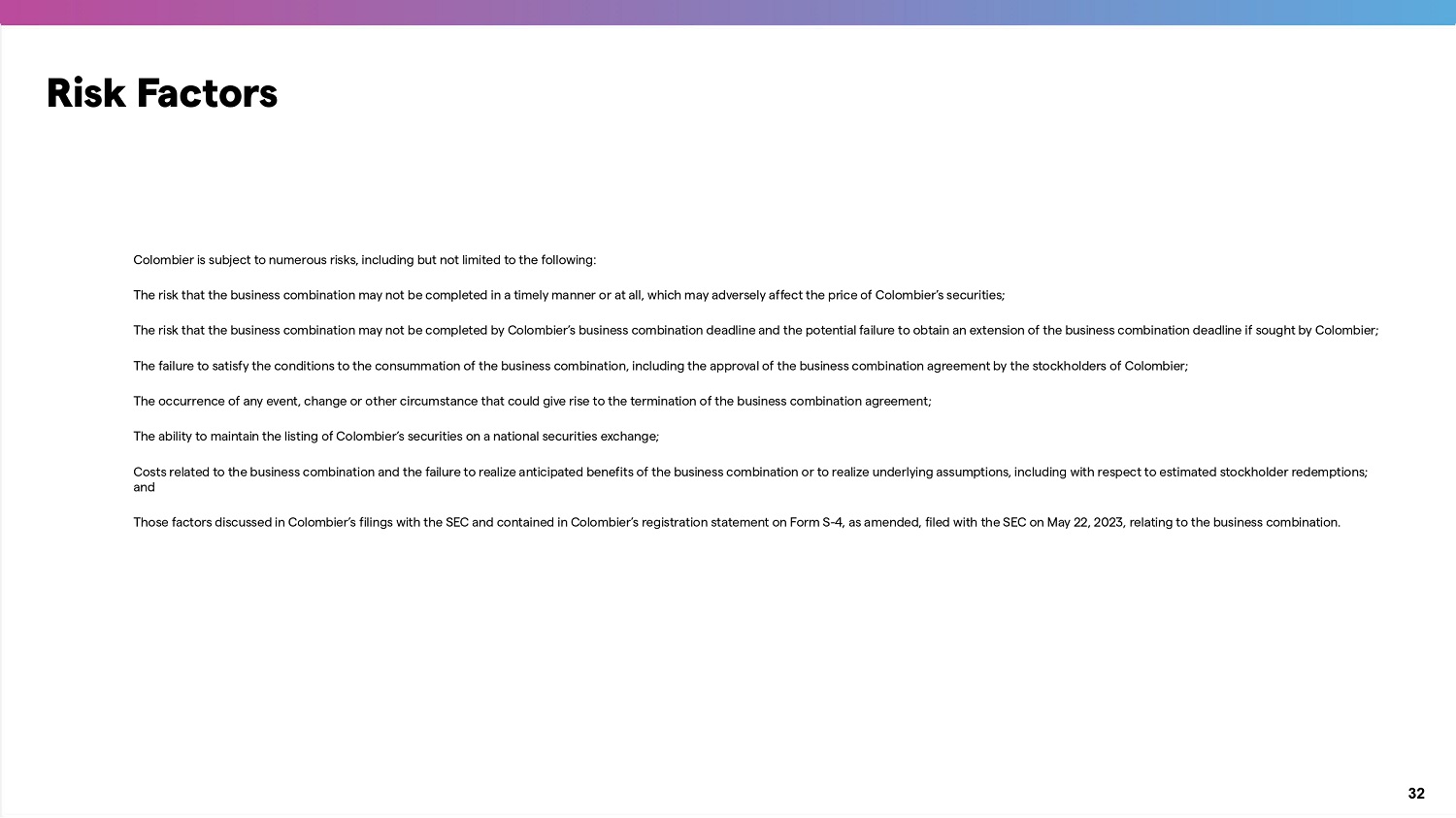 32 Colombier is subject to numerous risks, including but not limited to the following: The risk that the business combination may not be completed in a timely manner or at all, which may adversely affect the price of Colombier’s securities; The risk that the business combination may not be completed by Colombier’s business combination deadline and the potential failure to obtain an extension of the business combination deadline if sought by Colombier; The failure to satisfy the conditions to the consummation of the business combination, including the approval of the business combination agreement by the stockholders of Colombier; The occurrence of any event, change or other circumstance that could give rise to the termination of the business combination agreement; The ability to maintain the listing of Colombier’s securities on a national securities exchange; Costs related to the business combination and the failure to realize anticipated benefits of the business combination or to realize underlying assumptions, including with respect to estimated stockholder redemptions; and Those factors discussed in Colombier’s filings with the SEC and contained in Colombier’s registration statement on Form S - 4, as amended, filed with the SEC on May 22, 2023, relating to the business combination. Risk F ac t o r s