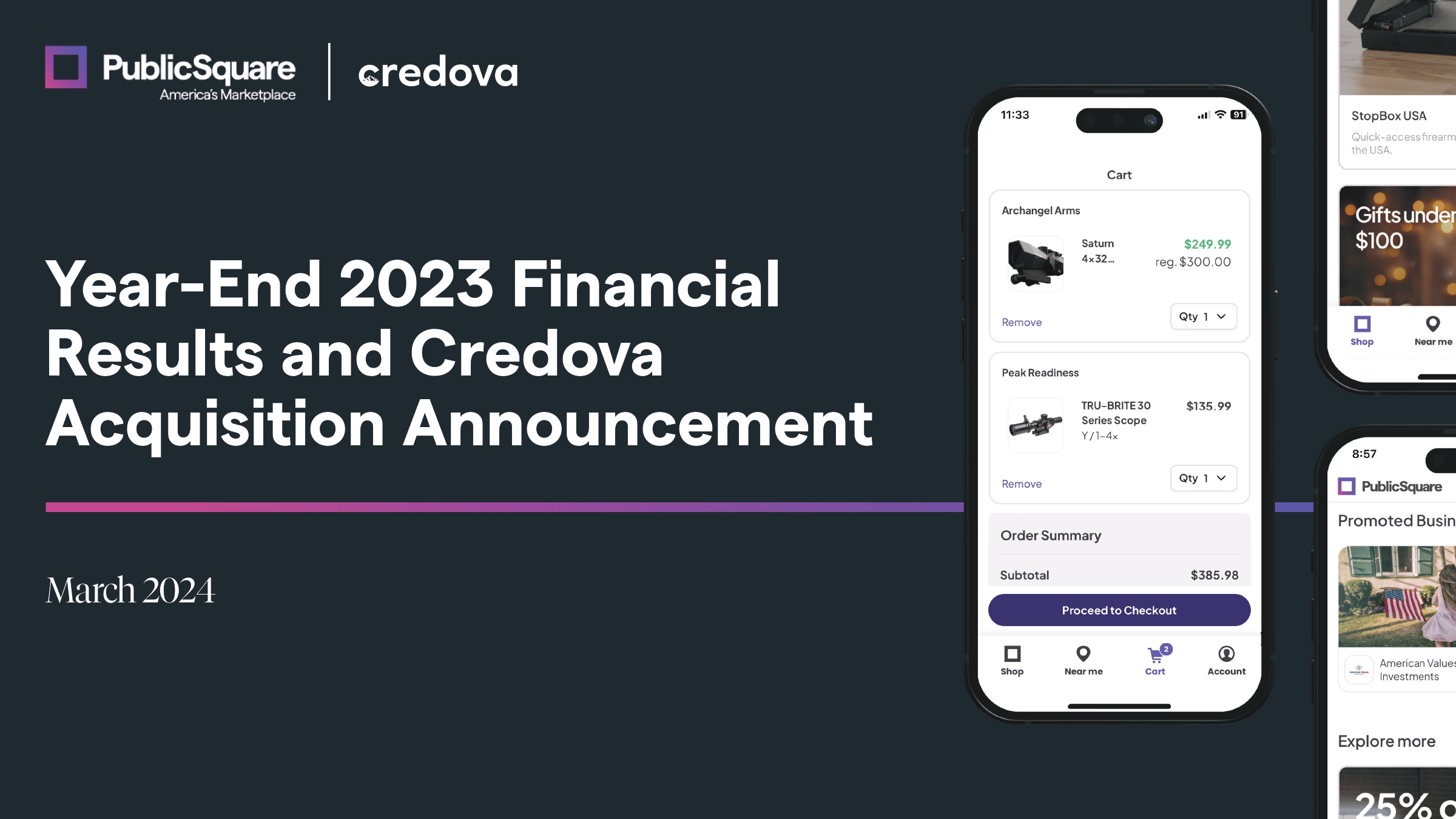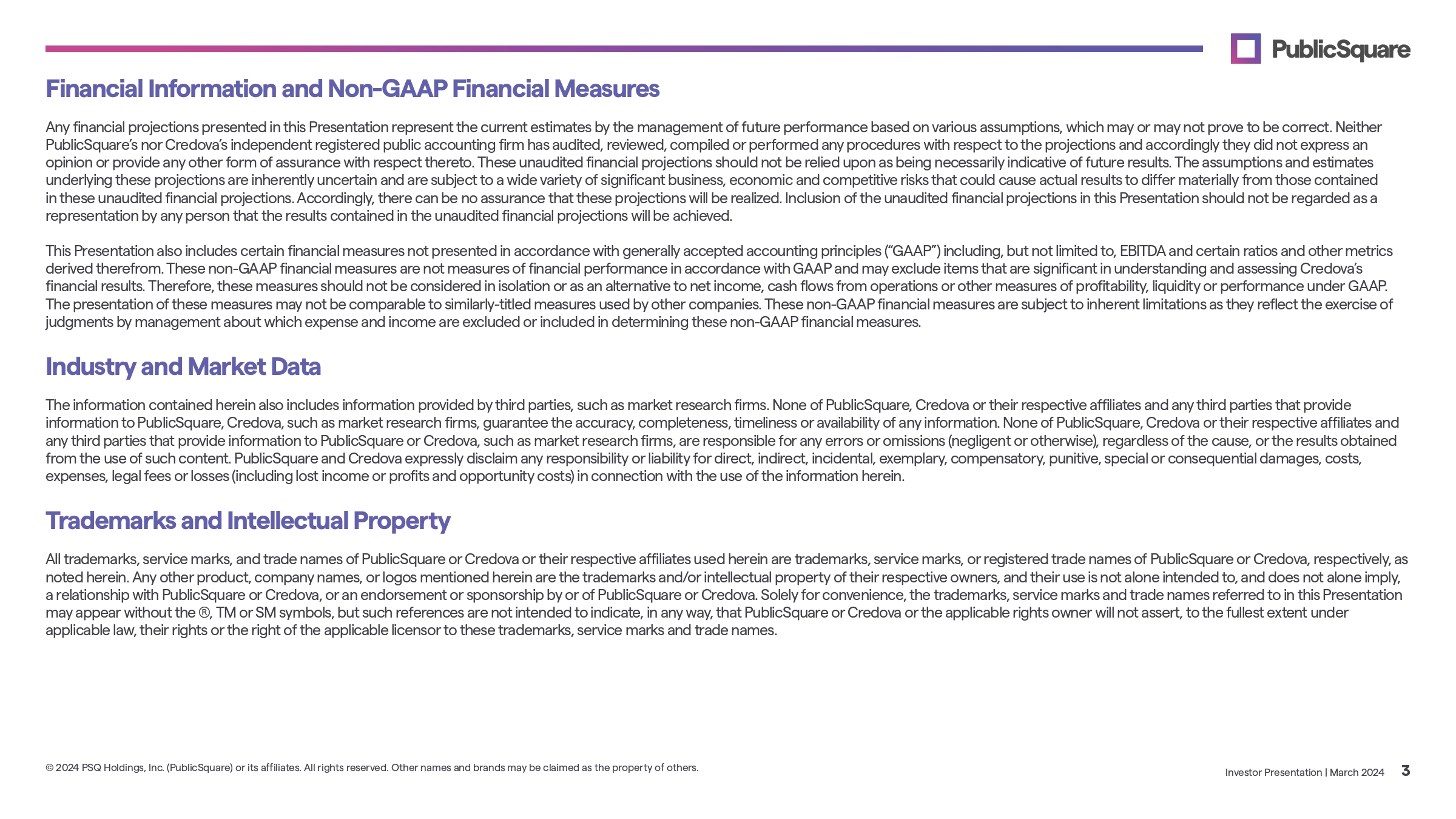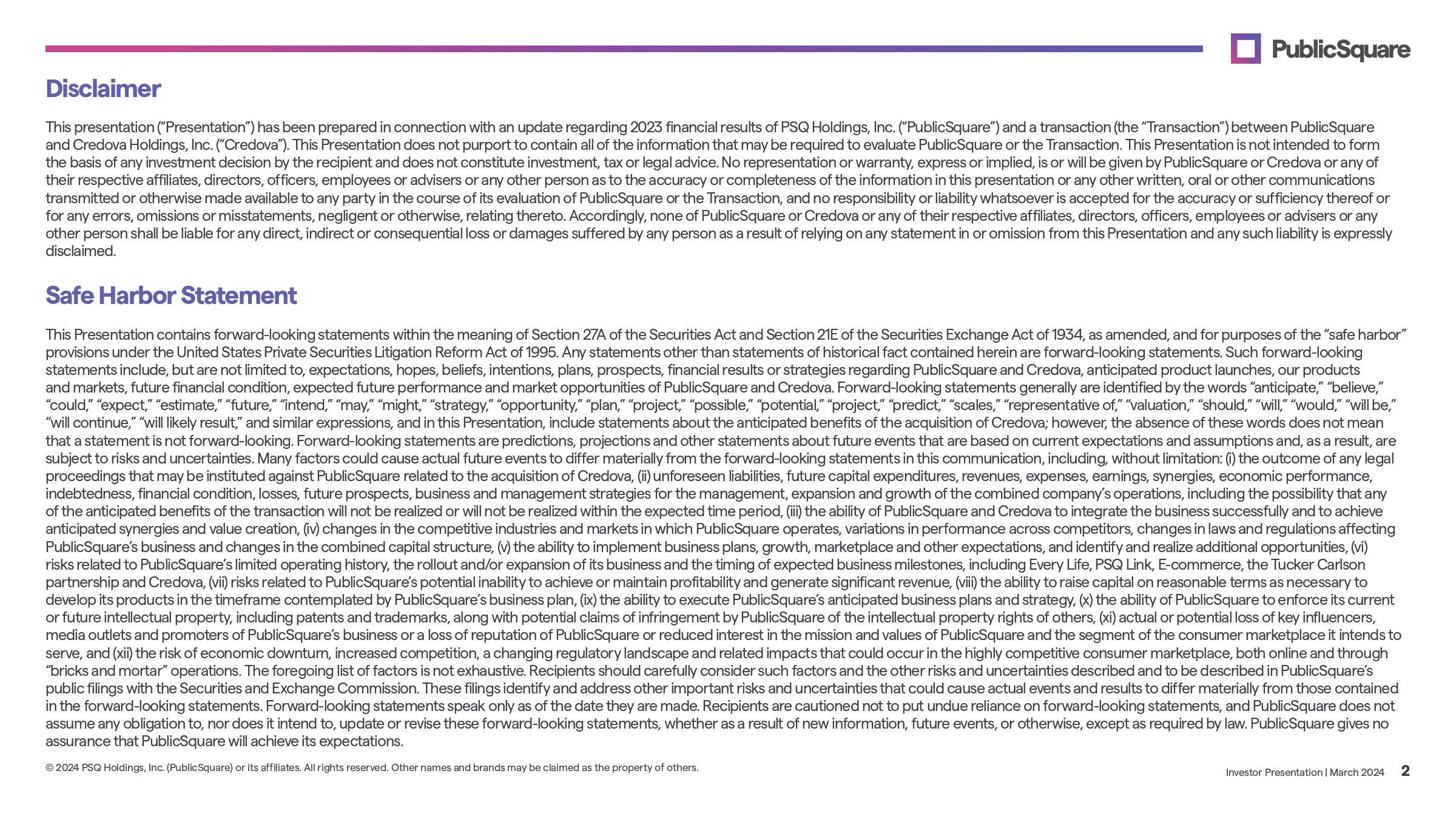 Disclaimer Investor Presentation | March 2024 2 © 2024 PSQ Holdings, Inc. (PublicSquare) or its affiliates. All rights reserved. Other names and brands may be claimed as the property of others. This presentation (“Presentation”) has been prepared in connection with an update regarding 2023 financial results of PSQ Holdings, Inc. (“PublicSquare”) and a transaction (the “Transaction”) between PublicSquare and Credova Holdings, Inc. (“Credova”). This Presentation does not purport to contain all of the information that may be required to evaluate PublicSquare or the Transaction. This Presentation is not intended to form the basis of any investment decision by the recipient and does not constitute investment, tax or legal advice. No representation or warranty, express or implied, is or will be given by PublicSquare or Credova or any of their respective affiliates, directors, officers, employees or advisers or any other person as to the accuracy or completeness of the information in this presentation or any other written, oral or other communications transmitted or otherwise made available to any party in the course of its evaluation of PublicSquare or the Transaction, and no responsibility or liability whatsoever is accepted for the accuracy or sufficiency thereof or for any errors, omissions or misstatements, negligent or otherwise, relating thereto. Accordingly, none of PublicSquare or Credova or any of their respective affiliates, directors, officers, employees or advisers or any other person shall be liable for any direct, indirect or consequential loss or damages suffered by any person as a result of relying on any statement in or omission from this Presentation and any such liability is expressly disclaimed. Safe Harbor Statement This Presentation contains forward - looking statements within the meaning of Section 27A of the Securities Act and Section 21E of the Securities Exchange Act of 1934, as amended, and for purposes of the “safe harbor” provisions under the United States Private Securities Litigation Reform Act of 1995. Any statements other than statements of historical fact contained herein are forward - looking statements. Such forward - looking statements include, but are not limited to, expectations, hopes, beliefs, intentions, plans, prospects, financial results or strategies regarding PublicSquare and Credova, anticipated product launches, our products and markets, future financial condition, expected future performance and market opportunities of PublicSquare and Credova. Forward - looking statements generally are identified by the words “anticipate,” “believe,” “could,” “expect,” “estimate,” “future,” “intend,” “may,” “might,” “strategy,” “opportunity,” “plan,” “project,” “possible,” “potential,” “project,” “predict,” “scales,” “representative of,” “valuation,” “should,” “will,” “would,” “will be,” “will continue,” “will likely result,” and similar expressions, and in this Presentation, include statements about the anticipated benefits of the acquisition of Credova; however, the absence of these words does not mean that a statement is not forward - looking. Forward - looking statements are predictions, projections and other statements about future events that are based on current expectations and assumptions and, as a result, are subject to risks and uncertainties. Many factors could cause actual future events to differ materially from the forward - looking statements in this communication, including, without limitation: (i) the outcome of any legal proceedings that may be instituted against PublicSquare related to the acquisition of Credova, (ii) unforeseen liabilities, future capital expenditures, revenues, expenses, earnings, synergies, economic performance, indebtedness, financial condition, losses, future prospects, business and management strategies for the management, expansion and growth of the combined company’s operations, including the possibility that any of the anticipated benefits of the transaction will not be realized or will not be realized within the expected time period, (iii) the ability of PublicSquare and Credova to integrate the business successfully and to achieve anticipated synergies and value creation, (iv) changes in the competitive industries and markets in which PublicSquare operates, variations in performance across competitors, changes in laws and regulations affecting PublicSquare’s business and changes in the combined capital structure, (v) the ability to implement business plans, growth, marketplace and other expectations, and identify and realize additional opportunities, (vi) risks related to PublicSquare’s limited operating history, the rollout and/or expansion of its business and the timing of expected business milestones, including Every Life, PSQ Link, E - commerce, the Tucker Carlson partnership and Credova, (vii) risks related to PublicSquare’s potential inability to achieve or maintain profitability and generate significant revenue, (viii) the ability to raise capital on reasonable terms as necessary to develop its products in the timeframe contemplated by PublicSquare’s business plan, (ix) the ability to execute PublicSquare’s anticipated business plans and strategy, (x) the ability of PublicSquare to enforce its current or future intellectual property, including patents and trademarks, along with potential claims of infringement by PublicSquare of the intellectual property rights of others, (xi) actual or potential loss of key influencers, media outlets and promoters of PublicSquare’s business or a loss of reputation of PublicSquare or reduced interest in the mission and values of PublicSquare and the segment of the consumer marketplace it intends to serve, and (xii) the risk of economic downturn, increased competition, a changing regulatory landscape and related impacts that could occur in