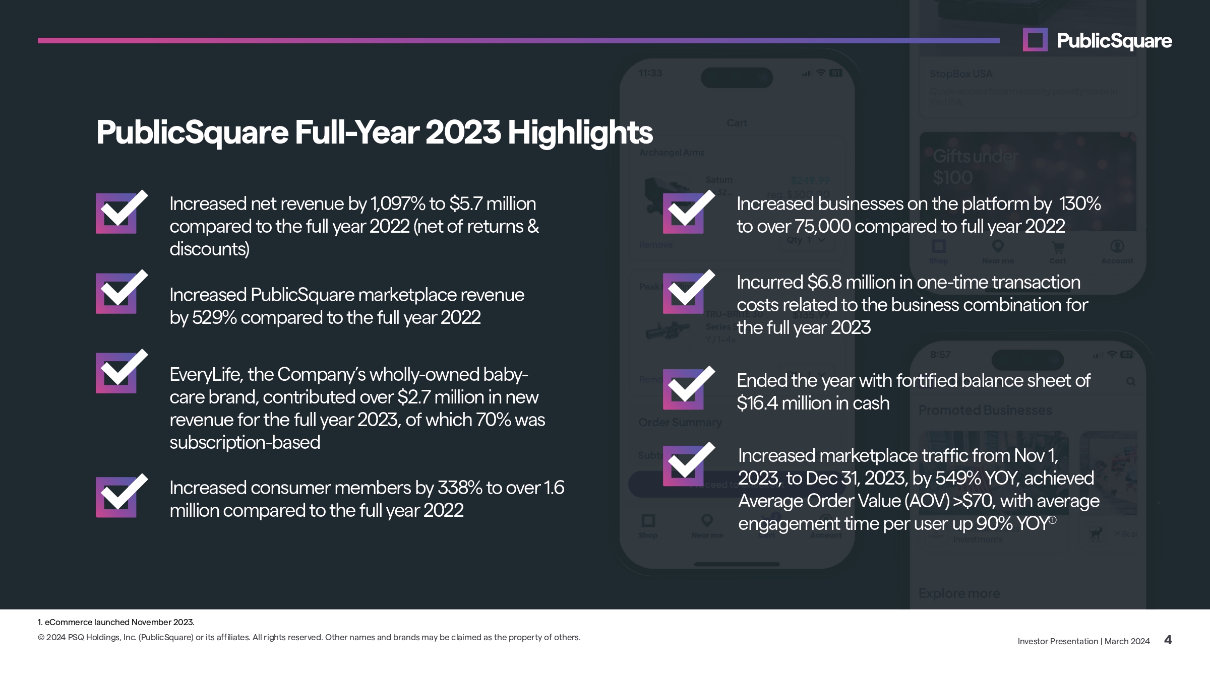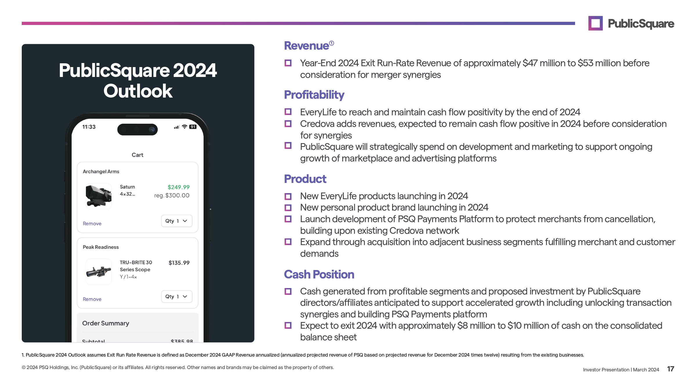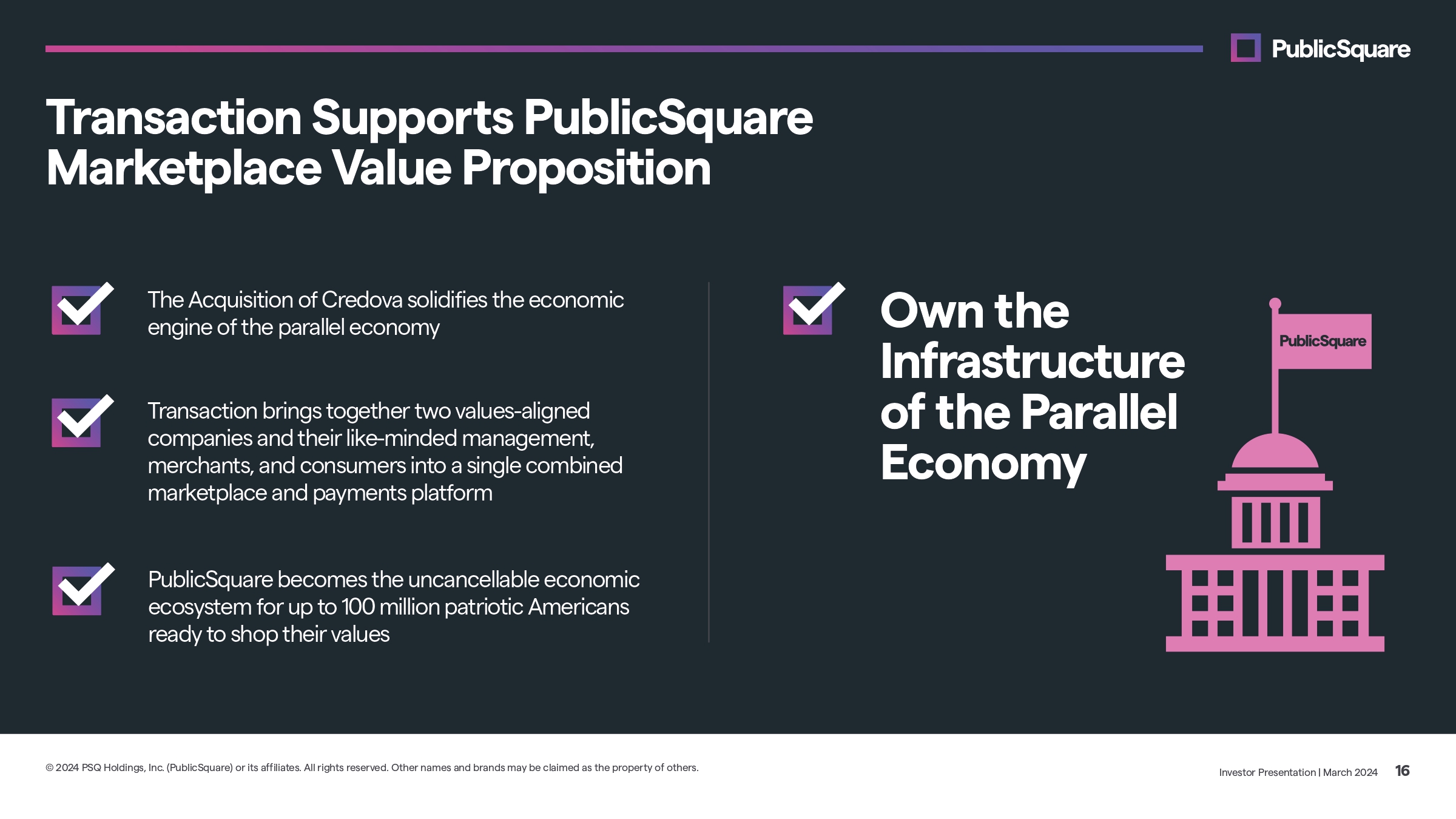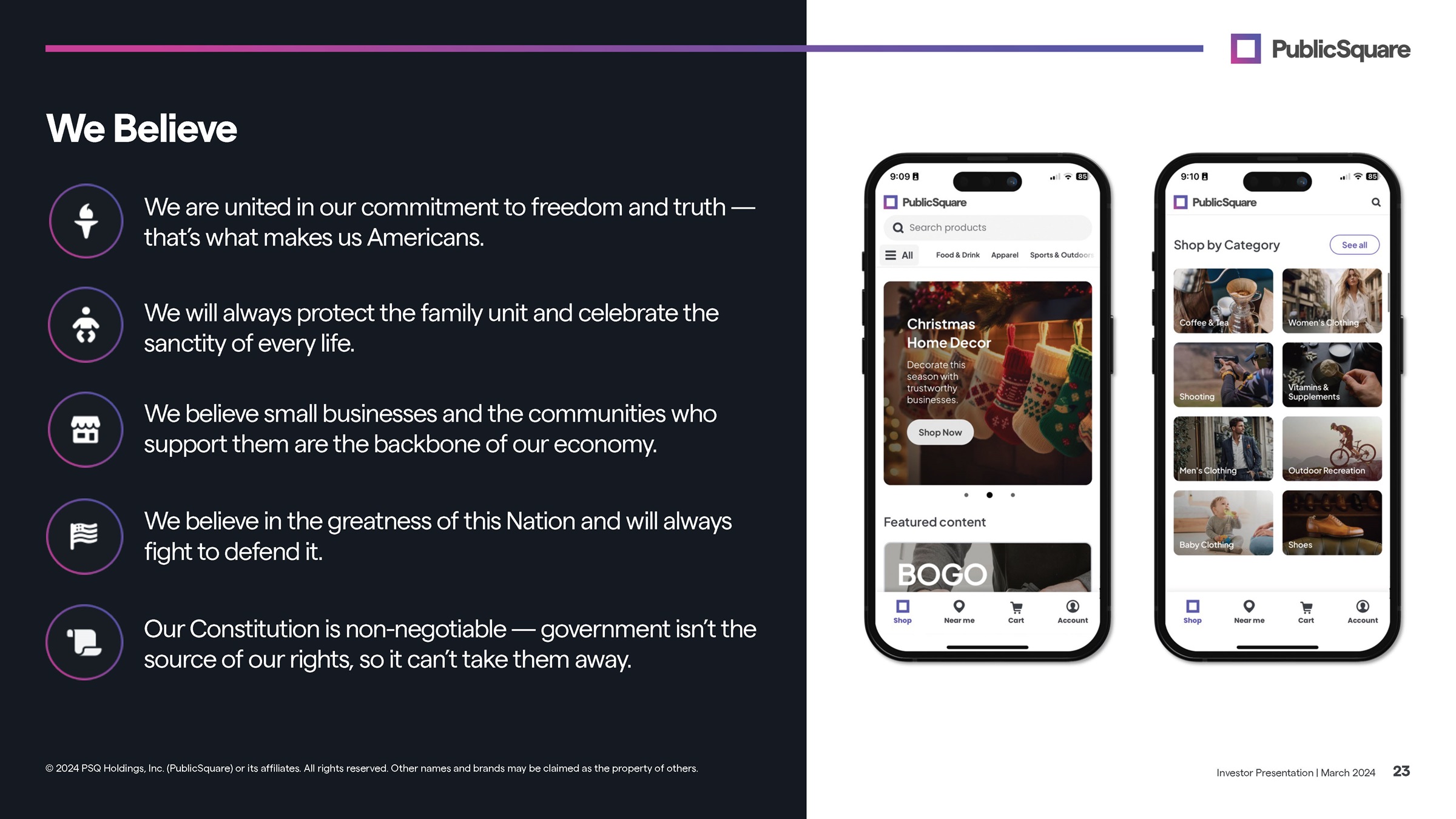 We Believe We are united in our commitment to freedom and truth — that’s what makes us Americans. We will always protect the family unit and celebrate the sanctity of every life. We believe small businesses and the communities who support them are the backbone of our economy. We believe in the greatness of this Nation and will always fight to defend it. Our Constitution is non - negotiable — government isn’t the source of our rights, so it can’t take them away. Investor Presentation | March 2024 23 © 2024 PSQ Holdings, Inc. (PublicSquare) or its affiliates. All rights reserved. Other names and brands may be claimed as the property of others.