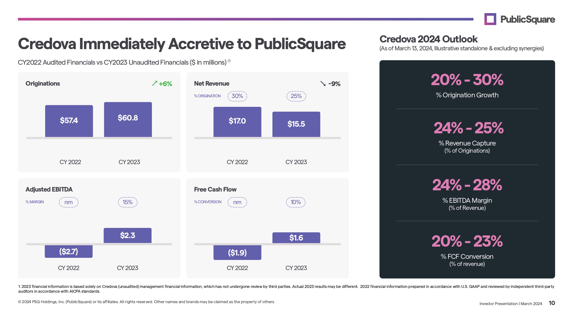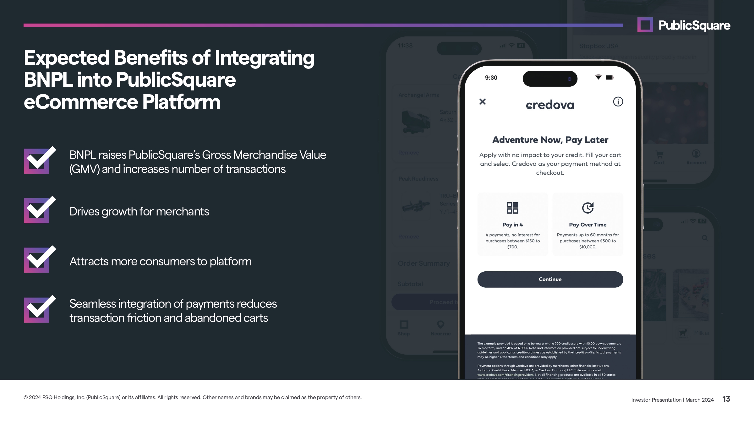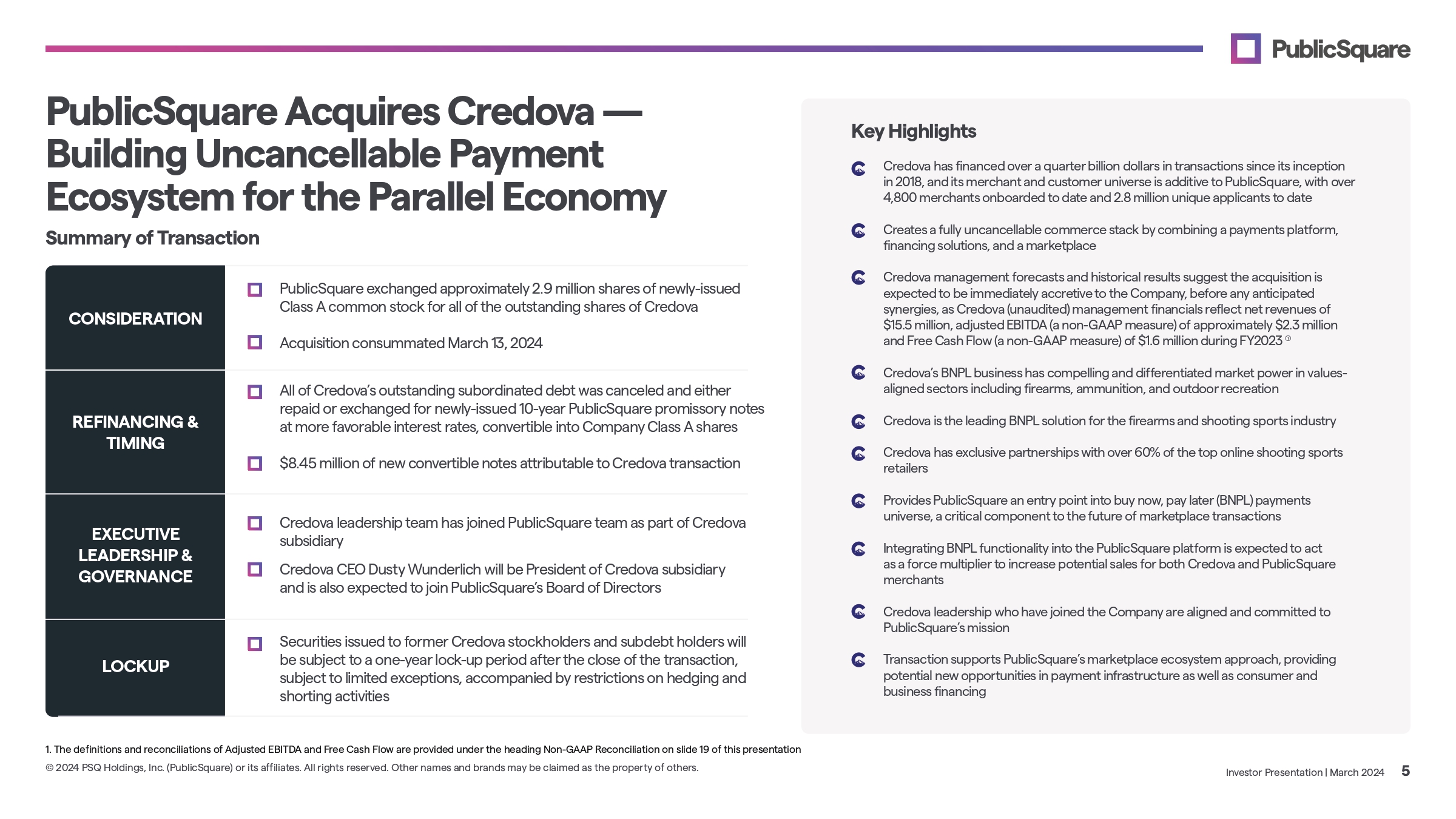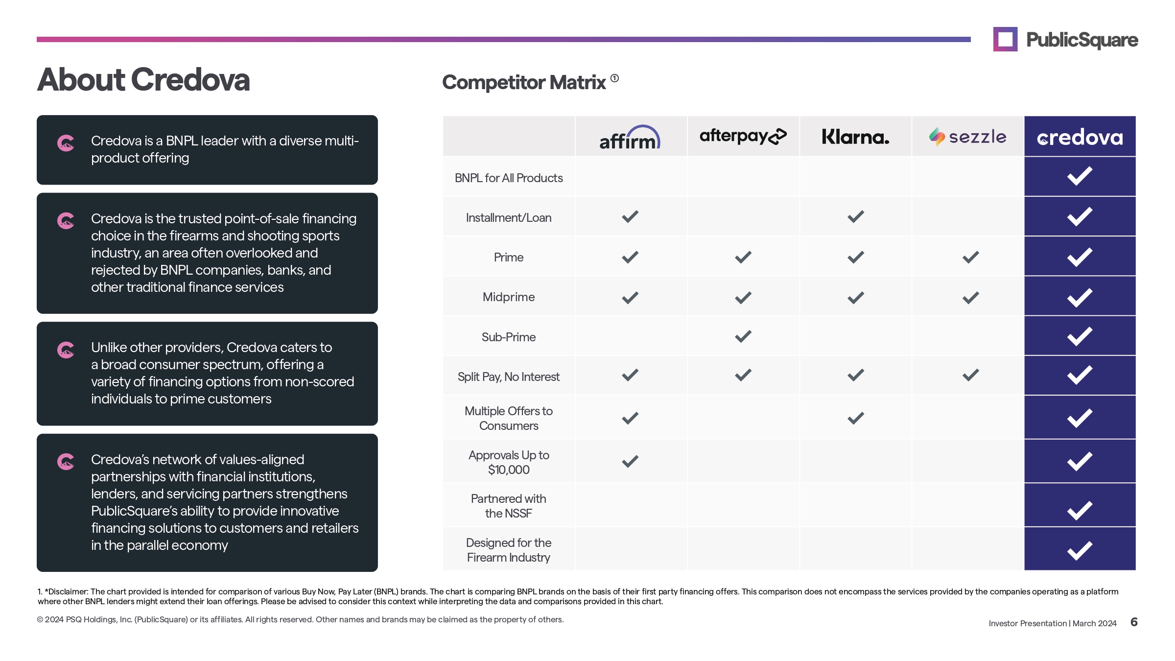 PublicSquare Acquires Credova — Building Uncancellable Payment Ecosystem for the Parallel Economy Summary of Transaction CONSIDERATION REFINANCING & TIMING EXECUTIVE LEADERSHIP & GOVERNANCE LOCKUP PublicSquare exchanged approximately 2.9 million shares of newly - issued Class A common stock for all of the outstanding shares of Credova Acquisition consummated March 13, 2024 Securities issued to former Credova stockholders and subdebt holders will be subject to a one - year lock - up period after the close of the transaction, subject to limited exceptions, accompanied by restrictions on hedging and shorting activities Credova leadership team has joined PublicSquare team as part of Credova subsidiary Credova CEO Dusty Wunderlich will be President of Credova subsidiary and is also expected to join PublicSquare’s Board of Directors Creates a fully uncancellable commerce stack by combining a payments platform, financing solutions, and a marketplace Credova management forecasts and historical results suggest the acquisition is expected to be immediately accretive to the Company, before any anticipated synergies, as Credova (unaudited) management financials reflect net revenues of $15.5 million, adjusted EBITDA (a non - GAAP measure) of approximately $2.3 million and Free Cash Flow (a non - GAAP measure) of $1.6 million during FY2023 Credova’s BNPL business has compelling and differentiated market power in values - aligned sectors including firearms, ammunition, and outdoor recreation Credova is the leading BNPL solution for the firearms and shooting sports industry Credova has exclusive partnerships with over 60% of the top online shooting sports retailers Provides PublicSquare an entry point into buy now, pay later (BNPL) payments universe, a critical component to the future of marketplace transactions Integrating BNPL functionality into the PublicSquare platform is expected to act as a force multiplier to increase potential sales for both Credova and PublicSquare merchants Credova leadership who have joined the Company are aligned and committed to PublicSquare’s mission Transaction supports PublicSquare’s marketplace ecosystem approach, providing potential new opportunities in payment infrastructure as well as consumer and business financing Key Highlights Credova has financed over a quarter billion dollars in transactions since its inception in 2018, and its merchant and customer universe is additive to PublicSquare, with over 4,800 merchants onboarded to date and 2.8 million unique applicants to date 1. The definitions and reconciliations of Adjusted EBITDA and Free Cash Flow are provided under the heading Non - GAAP Reconciliation on slide 19 of this presentation Investor Presentation | March 2024 5 © 2024 PSQ Holdings, Inc. (PublicSquare) or its affiliates. All rights reserved. Other names and brands may be claimed as the property of others. All of Credova’s outstanding subordinated debt was canceled and either repaid or exchanged for newly - issued 10 - year PublicSquare promissory notes at more favorable interest rates, convertible into Company Class A shares $8.45 million of new convertible notes attributable to Credova transaction