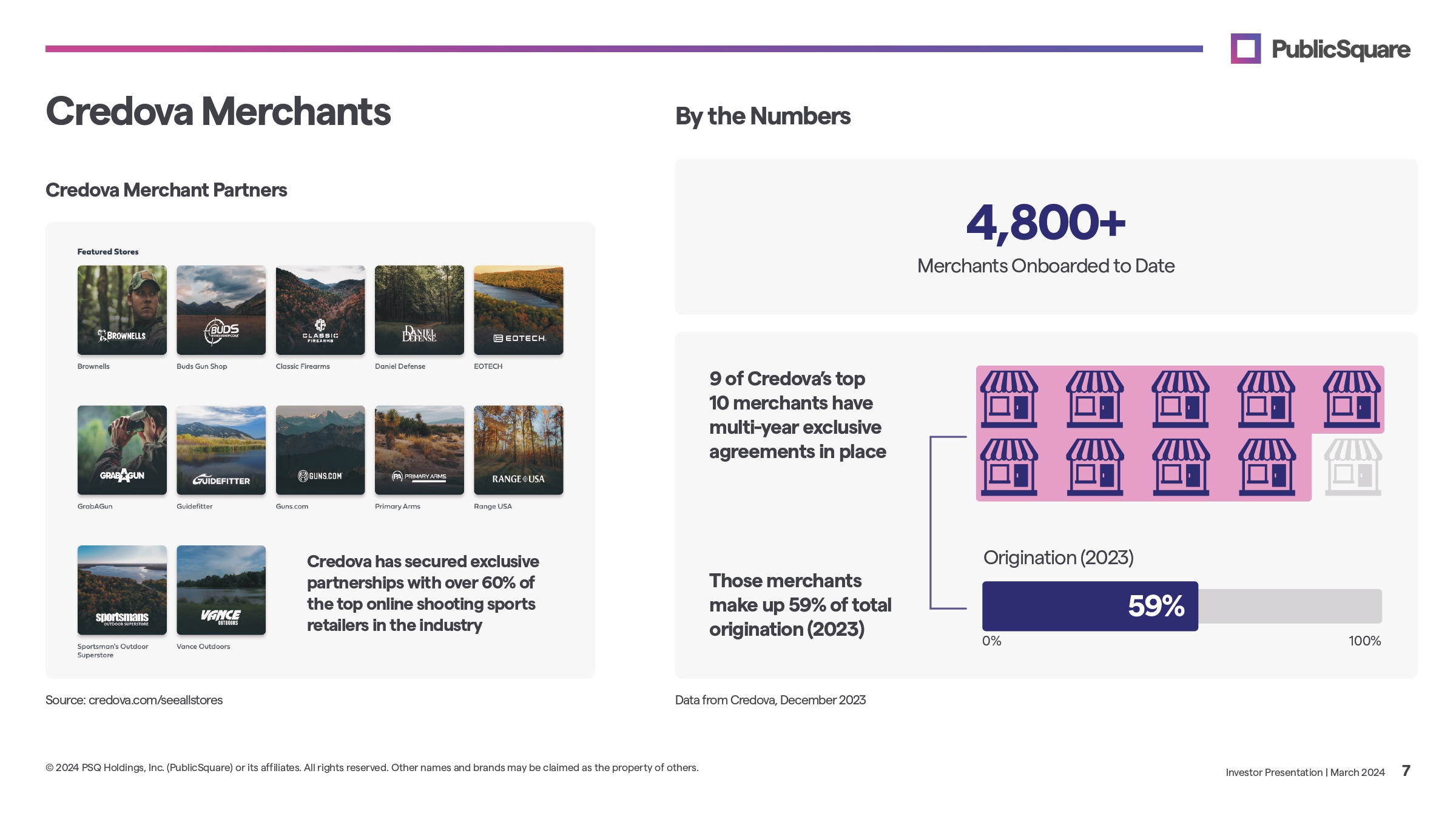 About Credova Competitor Matrix BNPL for All Products Installment/Loan Prime Midprime Sub - Prime Split Pay, No Interest Multiple Offers to Consumers Approvals Up to $10,000 Partnered with the NSSF Designed for the Firearm Industry Credova is a BNPL leader with a diverse multi - product offering Credova is the trusted point - of - sale financing choice in the firearms and shooting sports industry, an area often overlooked and rejected by BNPL companies, banks, and other traditional finance services Unlike other providers, Credova caters to a broad consumer spectrum, offering a variety of financing options from non - scored individuals to prime customers Credova’s network of values - aligned partnerships with financial institutions, lenders, and servicing partners strengthens PublicSquare’s ability to provide innovative financing solutions to customers and retailers in the parallel economy 1. *Disclaimer: The chart provided is intended for comparison of various Buy Now, Pay Later (BNPL) brands. The chart is comparing BNPL brands on the basis of their first party financing offers. This comparison does not encompass the services provided by the companies operating as a platform where other BNPL lenders might extend their loan offerings. Please be advised to consider this context while interpreting the data and comparisons provided in this chart. Investor Presentation | March 2024 6 © 2024 PSQ Holdings, Inc. (PublicSquare) or its affiliates. All rights reserved. Other names and brands may be claimed as the property of others.