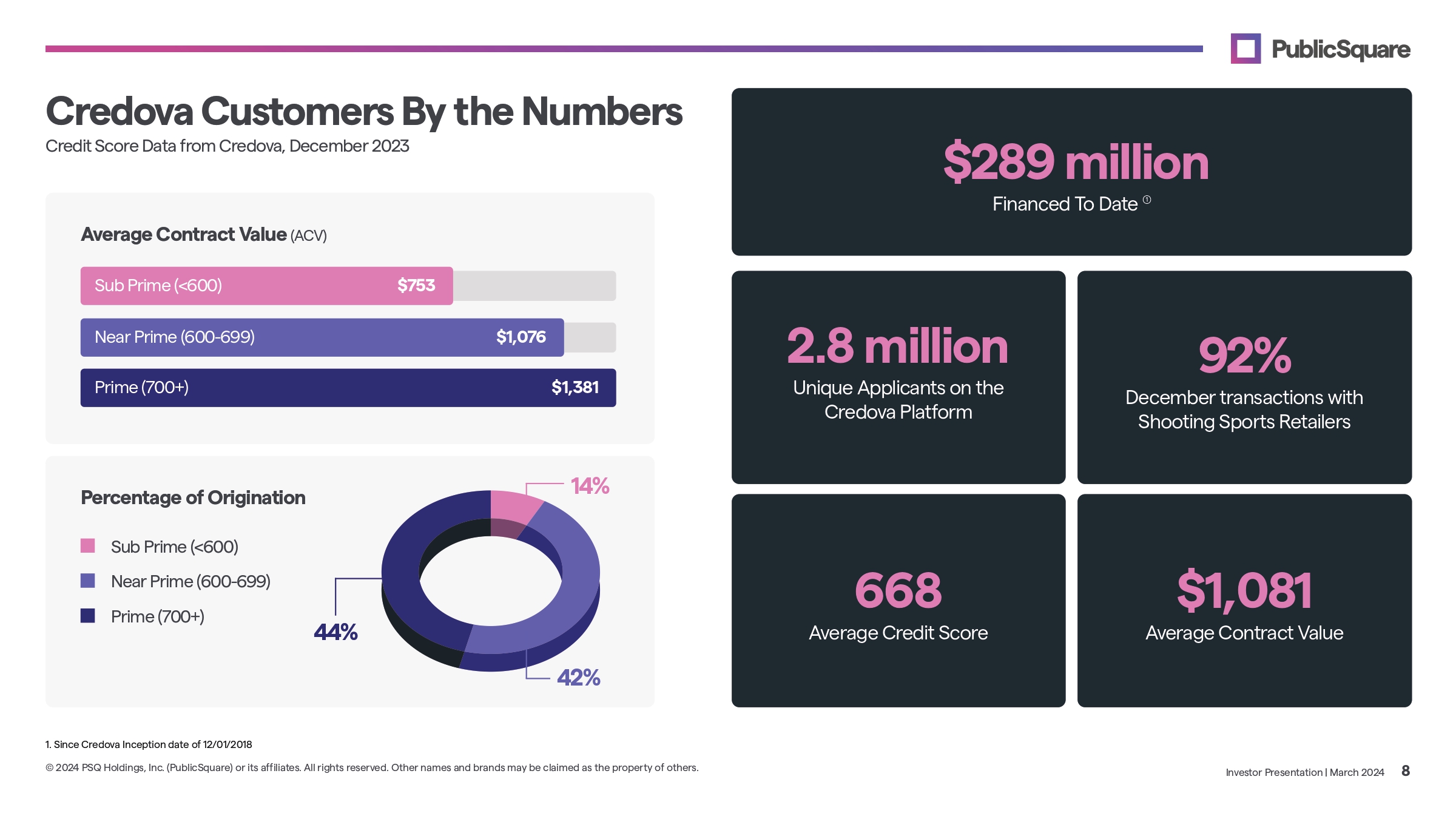Credova Merchants 4,800+ Merchants Onboarded to Date 9 of Credova’s top 10 merchants have multi - year exclusive agreements in place Those merchants make up 59% of total origination (2023) Data from Credova, December 2023 Source: credova.com/seeallstores By the Numbers Credova Merchant Partners 100% Investor Presentation | March 2024 7 © 2024 PSQ Holdings, Inc. (PublicSquare) or its affiliates. All rights reserved. Other names and brands may be claimed as the property of others. Origination (2023) 59% 0% Credova has secured exclusive partnerships with over 60 % of the top online shooting sports retailers in the industry
