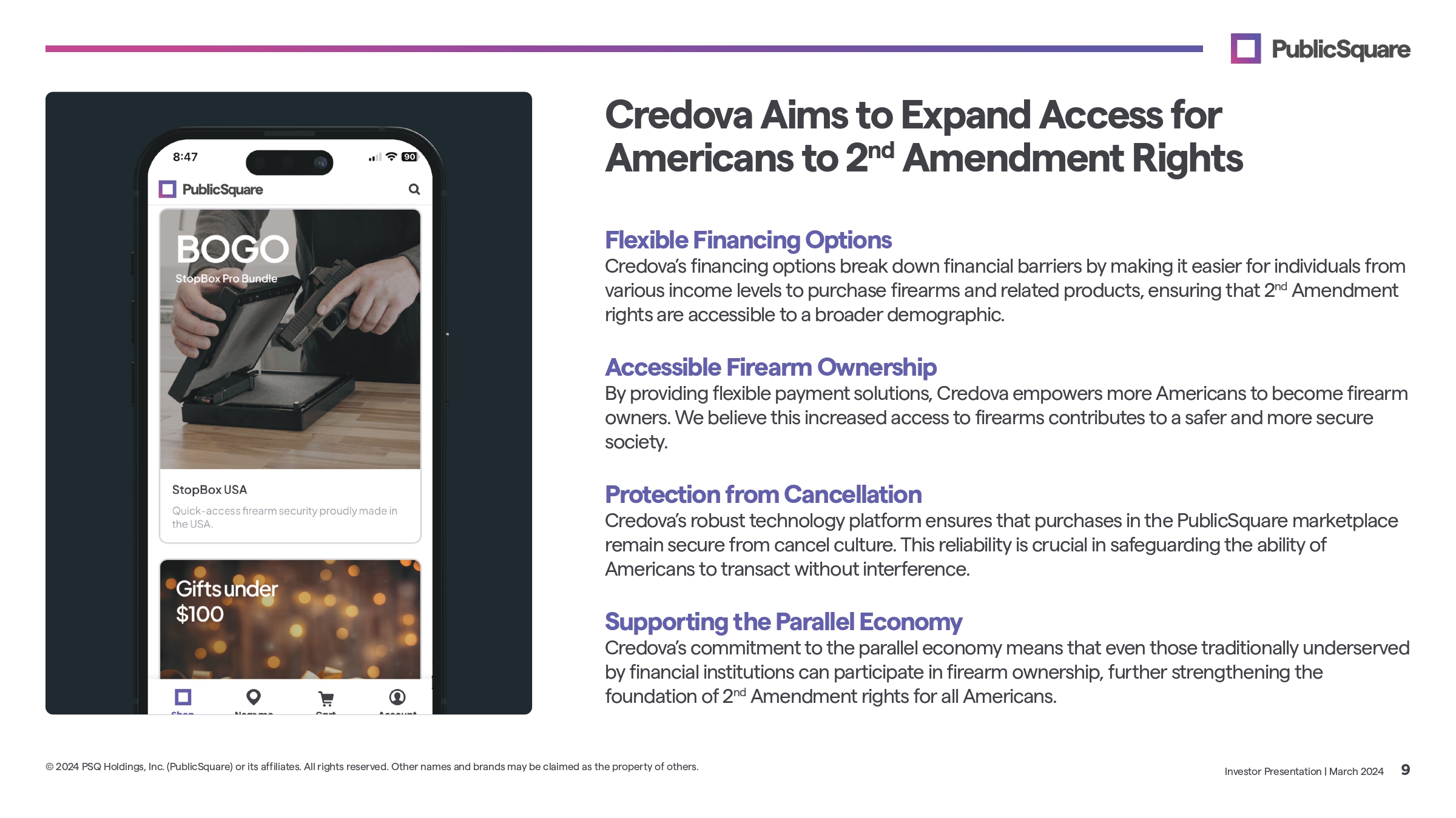 Flexible Financing Options Credova’s financing options break down financial barriers by making it easier for individuals from various income levels to purchase firearms and related products, ensuring that 2 nd Amendment rights are accessible to a broader demographic. Accessible Firearm Ownership By providing flexible payment solutions, Credova empowers more Americans to become firearm owners. We believe this increased access to firearms contributes to a safer and more secure society. Protection from Cancellation Credova’s robust technology platform ensures that purchases in the PublicSquare marketplace remain secure from cancel culture. This reliability is crucial in safeguarding the ability of Americans to transact without interference. Supporting the Parallel Economy Credova’s commitment to the parallel economy means that even those traditionally underserved by financial institutions can participate in firearm ownership, further strengthening the foundation of 2 nd Amendment rights for all Americans. Credova Aims to Expand Access for Americans to 2 nd Amendment Rights Investor Presentation | March 2024 9 © 2024 PSQ Holdings, Inc. (PublicSquare) or its affiliates. All rights reserved. Other names and brands may be claimed as the property of others.