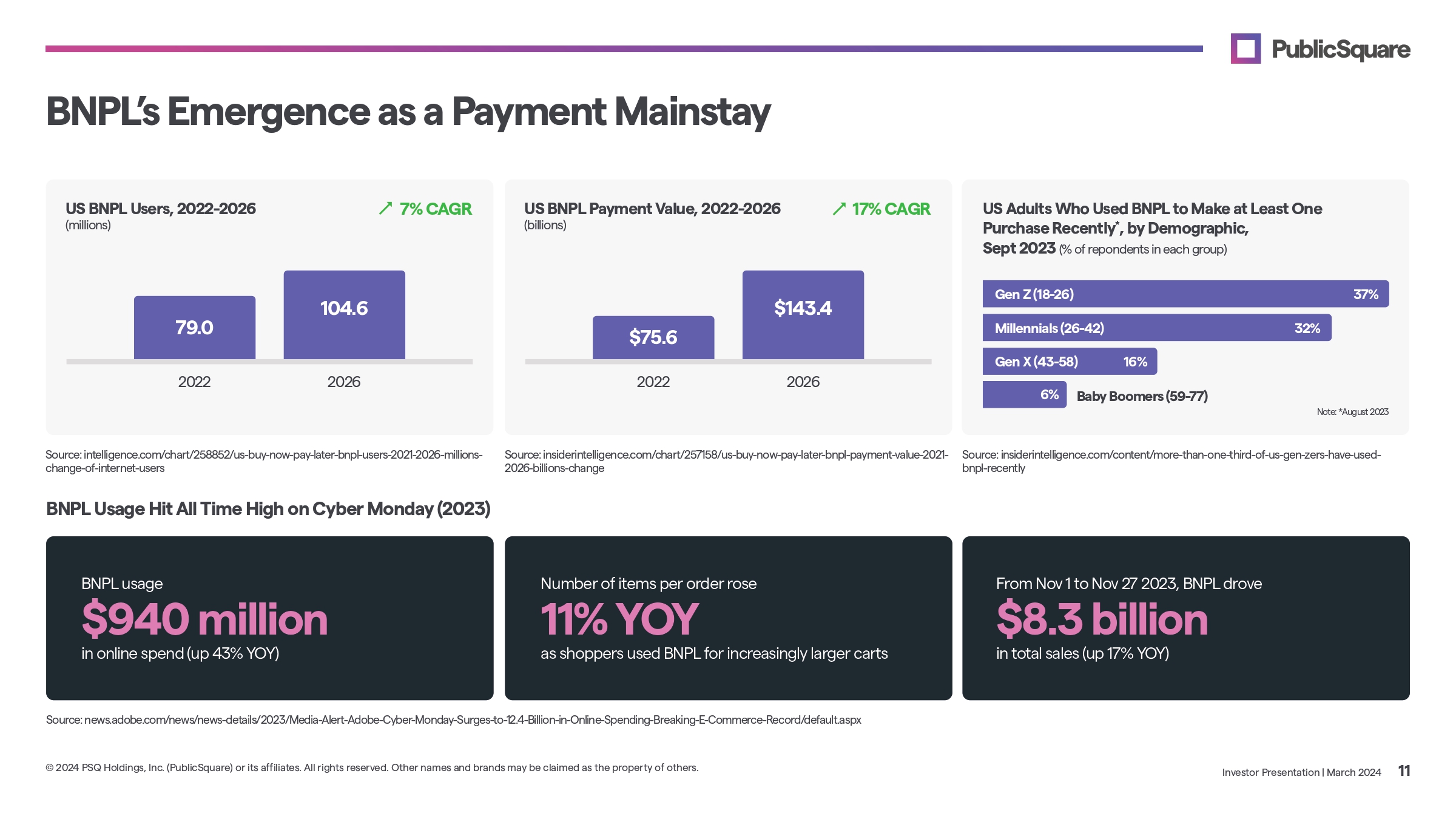 BNP L ’ s Emergence as a Payment Mainstay From Nov 1 to Nov 27 2023, BNPL drove $8.3 billion in total sales (up 17% YOY) BNPL usage $940 million in online spend (up 43% YOY) Number of items per order rose 11% YOY as shoppers used BNPL for increasingly larger carts Source: news.adobe.com/news/news - details/2023/Media - Alert - Adobe - Cyber - Monday - Surges - to - 12.4 - Billion - in - Online - Spending - Breaking - E - Commerce - Record/default.aspx BNPL Usage Hit All Time High on Cyber Monday (2023) US BNPL Users, 2022 - 2026 (millions) US Adults Who Used BNPL to Make at Least One Purchase Recently * , by Demographic, Sept 2023 (% of repondents in each group) Baby Boomers (59 - 77) Note: *August 2023 Source: intelligence.com/chart/258852/us - buy - now - pay - later - bnpl - users - 2021 - 2026 - millions - change - of - internet - users Source: insiderintelligence.com/content/more - than - one - third - of - us - gen - zers - have - used - bnpl - recently Source: insiderintelligence.com/chart/257158/us - buy - now - pay - later - bnpl - payment - value - 2021 - 2026 - billions - change US BNPL Payment Value, 2022 - 2026 (billions) 2022 2022 79.0 $75.6 37% 32% 16% 6% Gen Z (18 - 26) Millennials (26 - 42) Gen X (43 - 58) 104.6 $143.4 7% CAGR 17% CAGR 2026 2026 Investor Presentation | March 2024 11 © 2024 PSQ Holdings, Inc. (PublicSquare) or its affiliates. All rights reserved. Other names and brands may be claimed as the property of others.