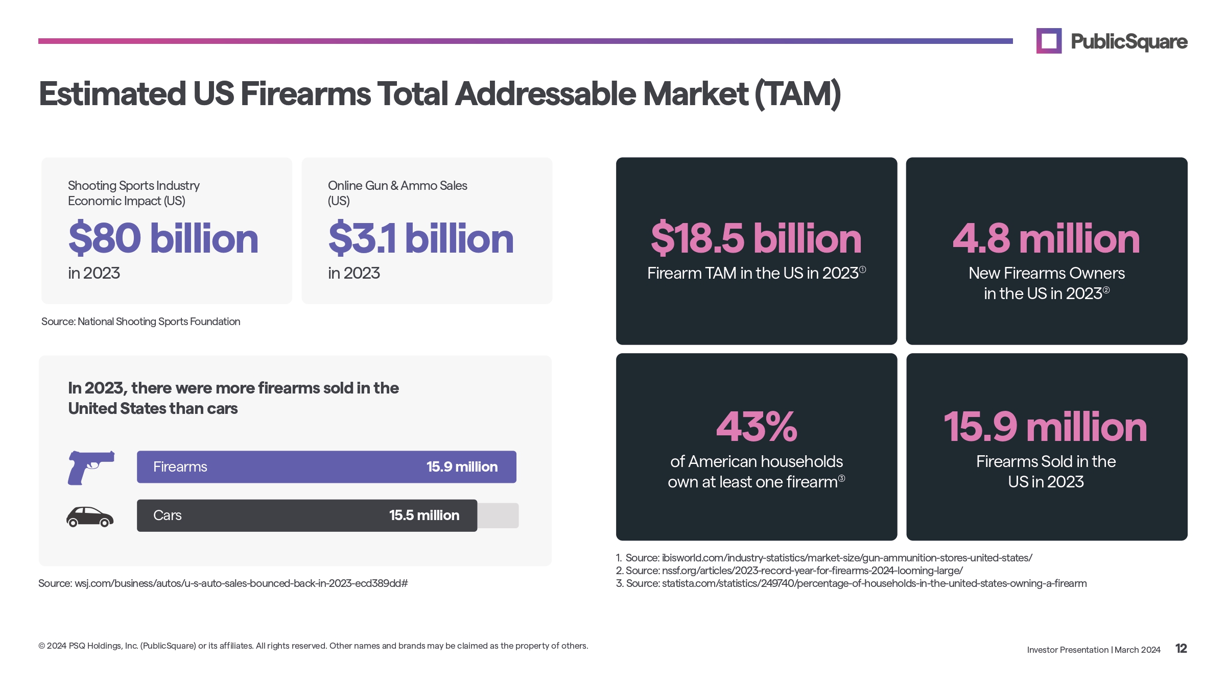 Estimated US Firearms Total Addressable Market (TAM) $18.5 billion Firearm TAM in the US in 2023 Shooting Sports Industry Economic Impact (US) $80 billion in 2023 Online Gun & Ammo Sales (US) $3 . 1 billion in 2023 43% of American households own at least one firearm (3) 15.9 million Firearms Sold in the US in 2023 4.8 million New Firearms Owners in the US in 2023 (2) 1. Source: ibisworld.com/industry - statistics/market - size/gun - ammunition - stores - united - states/ 2. Source: nssf.org/articles/2023 - record - year - for - firearms - 2024 - looming - large/ 3. Source: statista.com/statistics/249740/percentage - of - households - in - the - united - states - owning - a - firearm Source: wsj.com/business/autos/u - s - auto - sales - bounced - back - in - 2023 - ecd389dd# Source: National Shooting Sports Foundation In 2023, there were more firearms sold in the United States than cars 15.9 million Investor Presentation | March 2024 12 © 2024 PSQ Holdings, Inc. (PublicSquare) or its affiliates. All rights reserved. Other names and brands may be claimed as the property of others. Firearms Cars 15.5 million