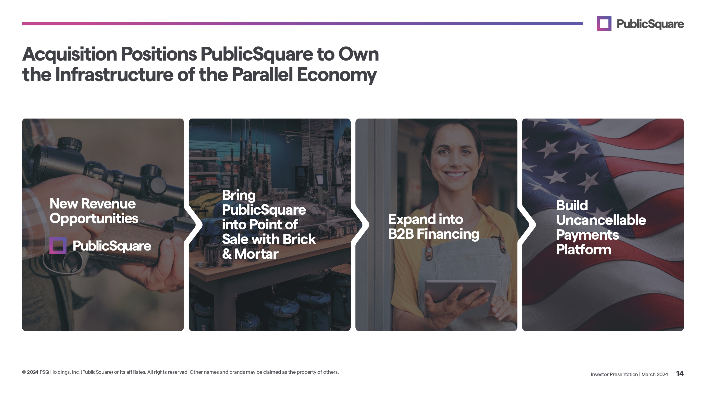 Expected Benefits of Integrating BNPL into PublicSquare eCommerce Platform BNPL raises PublicSquare’s Gross Merchandise Value (GMV) and increases number of transactions Drives growth for merchants Attracts more consumers to platform Seamless integration of payments reduces transaction friction and abandoned carts Investor Presentation | March 2024 13 © 2024 PSQ Holdings, Inc. (PublicSquare) or its affiliates. All rights reserved. Other names and brands may be claimed as the property of others.