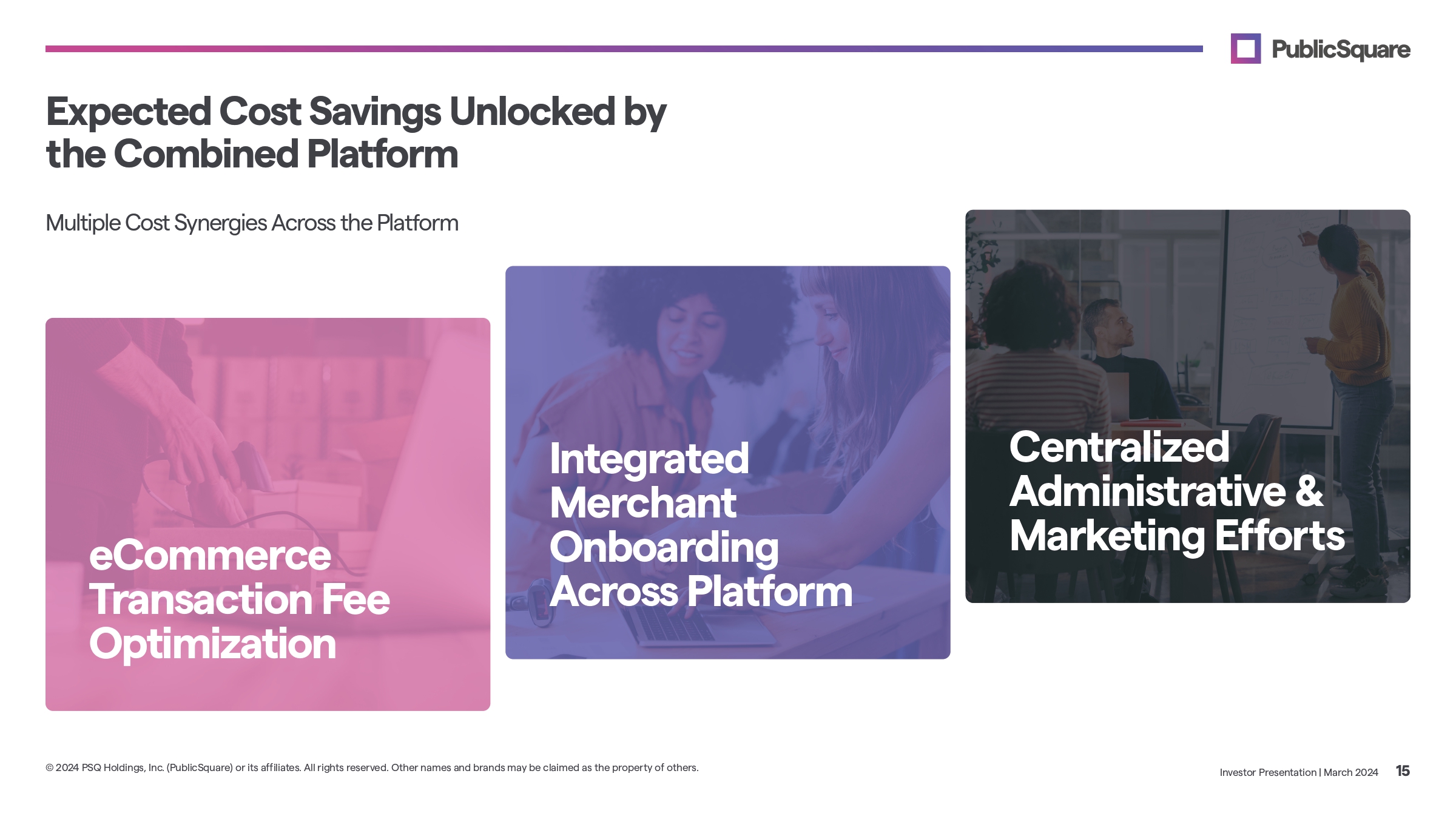 Acquisition Positions PublicSquare to Own the Infrastructure of the Parallel Economy New Revenue Opportunities Bring PublicSquare into Point of Sale with Brick & Mortar Expand into B2B Financing Build Uncancellable Payments Platform Investor Presentation | March 2024 14 © 2024 PSQ Holdings, Inc. (PublicSquare) or its affiliates. All rights reserved. Other names and brands may be claimed as the property of others.