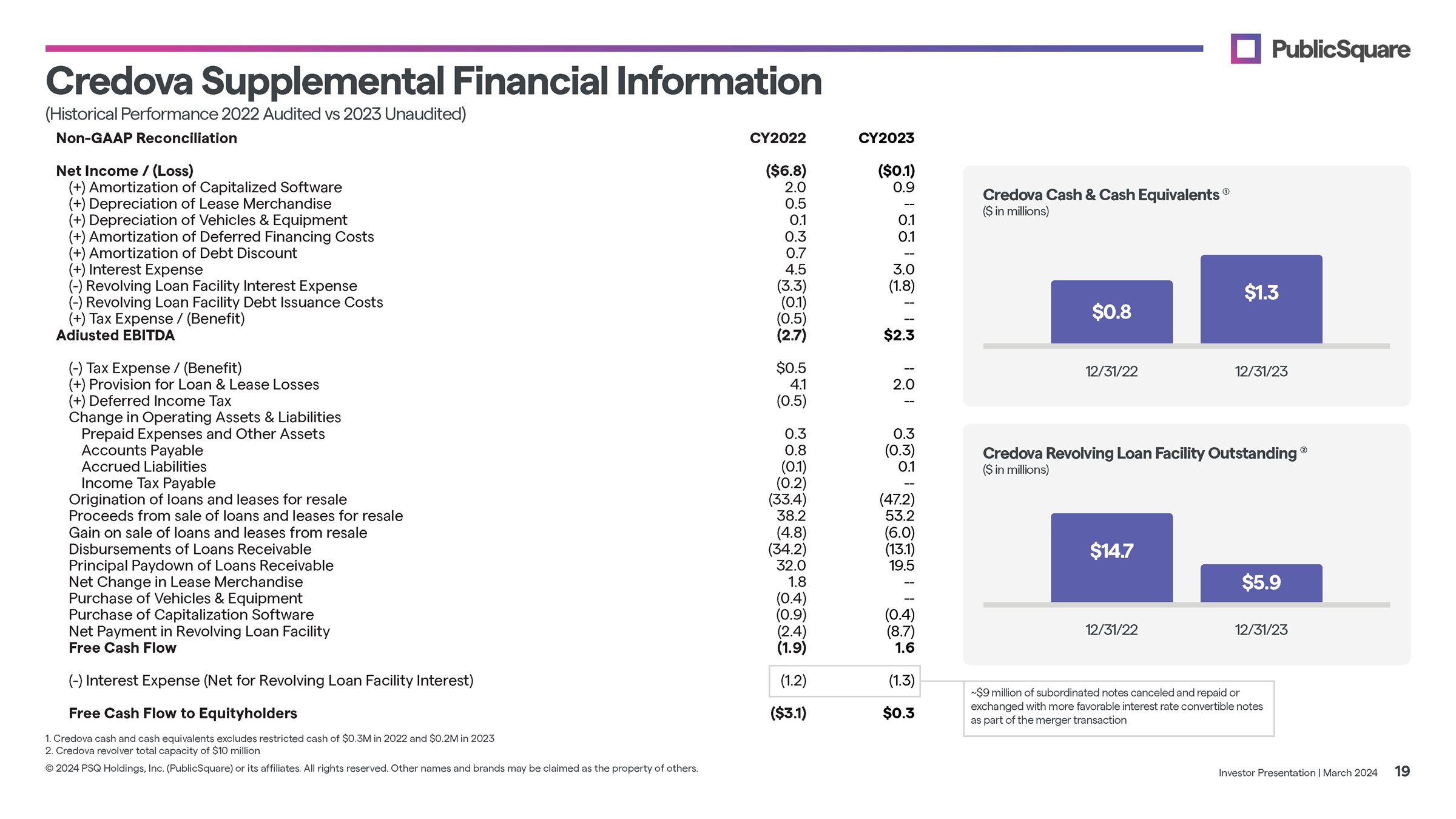 Credova Cash & Cash Equivalents ($ in millions) Investor Presentation | March 2024 19 © 2024 PSQ Holdings, Inc. (PublicSquare) or its affiliates. All rights reserved. Other names and brands may be claimed as the property of others. Credova Revolving Loan Facility Outstanding (2) ($ in millions) CY 2022 CY 2022 $1.3 $0.8 $14.7 $5.9 CY 2023 CY 2023 Supplemental Financial Information Adiusted EBITDA ( - ) Tax Expense / (Benefit) (+) Provision for Loan & Lease Losses (+) Deferred Income Tax Change in Operating Assets & Liabilities Prepaid Expenses and Other Assets Accounts Payable Accrued Liabilities Income Tax Payable CY2022 ($6.8) (2.7) $0.5 4.1 (0.5) 0.3 0.8 (0.1) (0.2) CY2023 ($0.1) 0.9 2.0 (+) Amortization of Capitalized Software - - 0.5 (+) Depreciation of Lease Merchandise 0.1 0.1 (+) Depreciation of Vehicles & Equipment 0.1 0.3 (+) Amortization of Deferred Financing Costs - - 0.7 (+) Amortization of Debt Discount 3.0 4.5 (+) Interest Expense (1.8) (3.3) ( - ) Revolving Loan Facility Interest Expense - - (0.1) ( - ) Revolving Loan Facility Debt Issuance Costs - - (0.5) (+) Tax Expense / (Benefit) $2.3 - - 2.0 - - 0.3 (0.3) 0.1 - - (47.2) (33.4) Origination of loans and leases for resale 53.2 38.2 Proceeds from sale of loans and leases for resale (6.0) (4.8) Gain on sale of loans and leases from resale (13.1) (34.2) Disbursements of Loans Receivable 19.5 32.0 Principal Paydown of Loans Receivable - - 1.8 Net Change in Lease Merchandise - - (0.4) Purchase of Vehicles & Equipment (0.4) (0.9) Purchase of Capitalization Software (8.7) (2.4) Net Payment in Revolving Loan Facility 1.6 (1.9) Free Cash Flow ( - ) Interest Expense (Net for Revolving Loan Facility Interest) Free Cash Flow to Equityholders 1. Credova cash and cash equivalents excludes restricted cash of $0.3M in 2022 and $0.2M in 2023 2. Credova revolver total capacity of $10 million. (Historical Performance 2022 Audited vs 2023 Unaudited) Non - GAAP Reconciliation Net Income / (Loss) (1.3) (1.2) ~$9 million of subordinated notes canceled and repaid or exchanged with more favorable interest rate convertible notes as part of the merger transaction $0.3 ($3.1)