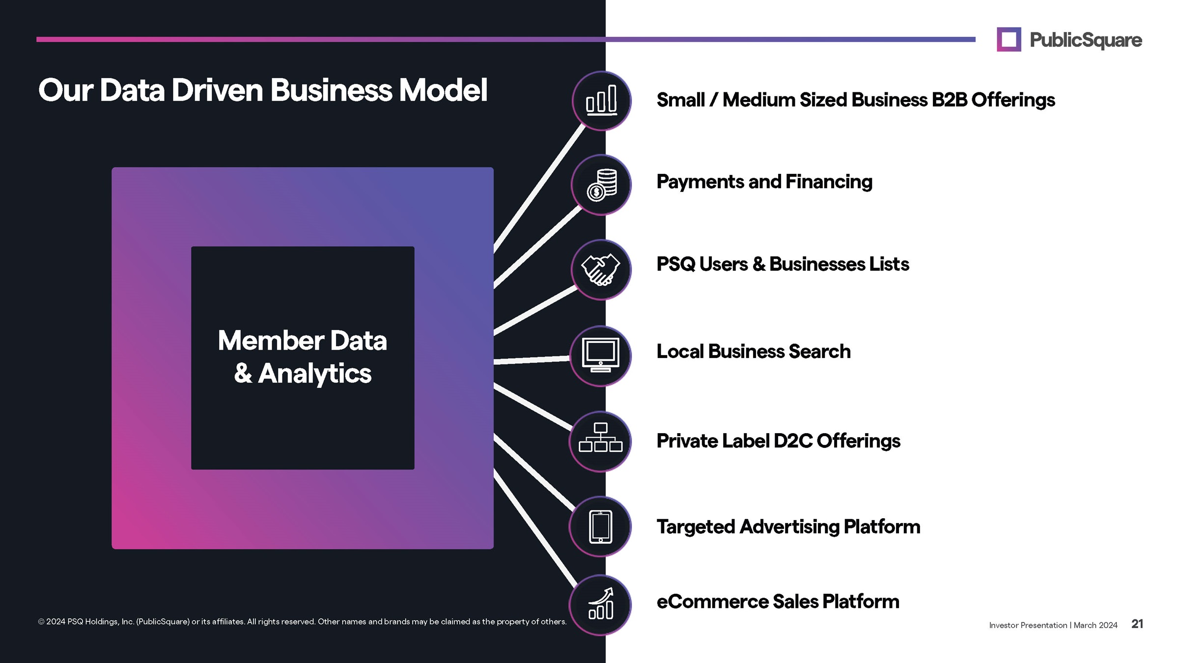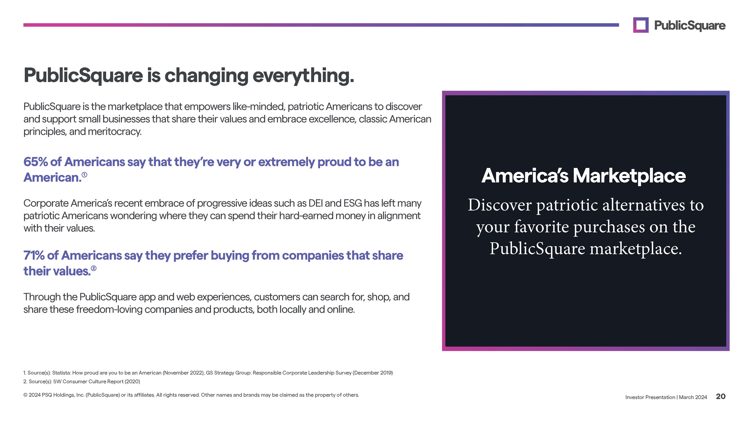 PublicSquare is the marketplace that empowers like - minded, patriotic Americans to discover and support small businesses that share their values and embrace excellence, classic American principles, and meritocracy. 65% of Americans say that they’re very or extremely proud to be an American. Corporate America’s recent embrace of progressive ideas such as DEI and ESG has left many patriotic Americans wondering where they can spend their hard - earned money in alignment with their values . 71% of Americans say they prefer buying from companies that share their values. (2) Through the PublicSquare app and web experiences, customers can search for, shop, and share these freedom - loving companies and products, both locally and online. Investor Presentation | March 2024 20 © 2024 PSQ Holdings, Inc. (PublicSquare) or its affiliates. All rights reserved. Other names and brands may be claimed as the property of others. PublicSquare is changing everything. Ameri c a ’ s Marketplace Discover patriotic alternatives to your favorite purchases on the PublicSquare marketplace. 1. Source(s): Statista: How proud are you to be an American (November 2022), GS Strategy Group: Responsible Corporate Leadership Survey (December 2019) 2. Source(s): 5W Consumer Culture Report (2020)
