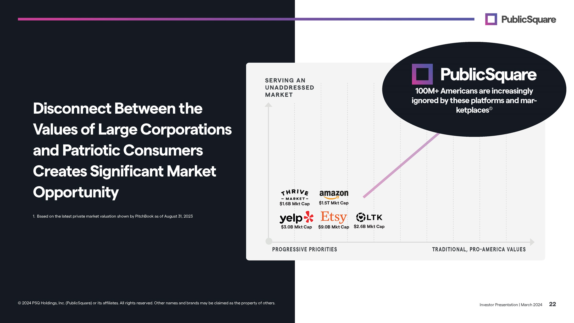 $1.5T Mkt Cap $1.6B Mkt Cap $3.0B Mkt Cap $9.0B Mkt Cap $2.6B Mkt Cap SERVING AN UNADDRESSED MARKET PROGRESSIVE PRIORITIES TRADITIONAL, PRO - AMERICA VALUES 100M+ Americans are increasingly ignored by these platforms and mar - ketplaces Investor Presentation | March 2024 22 © 2024 PSQ Holdings, Inc. (PublicSquare) or its affiliates. All rights reserved. Other names and brands may be claimed as the property of others. Disconnect Between the Values of Large Corporations and Patriotic Consumers Creates Significant Market Opportunity 1. Based on the latest private market valuation shown by PitchBook as of August 31, 2023