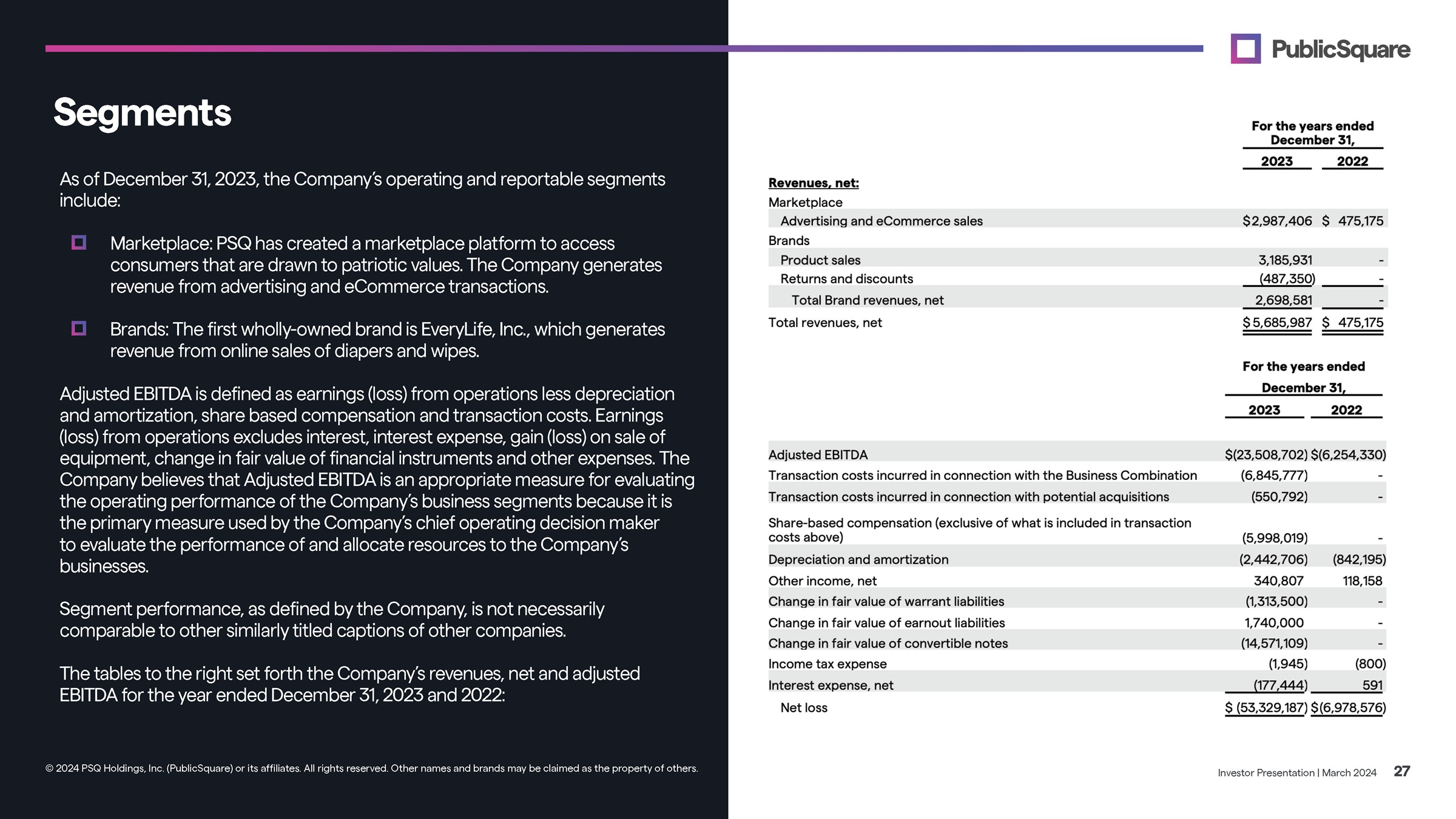 Segments As of December 31, 2023, the Company’s operating and reportable segments include: Marketplace: PSQ has created a marketplace platform to access consumers that are drawn to patriotic values. The Company generates revenue from advertising and eCommerce transactions. Brands: The first wholly - owned brand is EveryLife, Inc., which generates revenue from online sales of diapers and wipes. Adjusted EBITDA is defined as earnings (loss) from operations less depreciation and amortization, share based compensation and transaction costs. Earnings (loss) from operations excludes interest, interest expense, gain (loss) on sale of equipment, change in fair value of financial instruments and other expenses. The Company believes that Adjusted EBITDA is an appropriate measure for evaluating the operating performance of the Company’s business segments because it is the primary measure used by the Company’s chief operating decision maker to evaluate the performance of and allocate resources to the Company’s businesses. Segment performance, as defined by the Company, is not necessarily comparable to other similarly titled captions of other companies. The tables to the right set forth the Company’s revenues, net and adjusted EBITDA for the year ended December 31, 2023 and 2022: Investor Presentation | March 2024 27 © 2024 PSQ Holdings, Inc. (PublicSquare) or its affiliates. All rights reserved. Other names and brands may be claimed as the property of others.