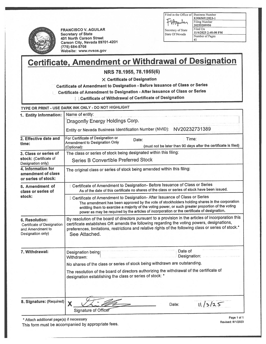 IN WITNESS WHEREOF, the Company has caused this Certificate of Designation of Dragonfly Energy Holdings Corp. to be signed by its President and Chief Executive Officer on this 4th day of November, 2025.
