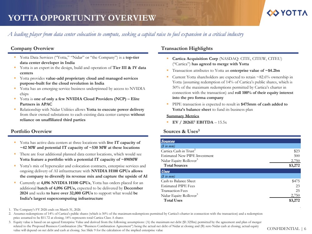 CONFIDENTIAL | 6 YOTTA OPPORTUNITY OVERVIEW A leading player from data center colocation to compute, seeking a capital raise to fuel expansion in a critical industry 1. The Company’s FY 2026 ends on March 31, 2026 2. Assumes redemptions of 14% of Cartica's public shares (which is 50% of the maximum redemptions permitted by Cartica's charter in connection with the transaction) and a redemption price assumed to be $11.72 at closing; 14% represents total Cartica Class A shares 3. Equity value is based an agreed Enterprise Value and derived on the following assumptions: (A) the maximum net debt ($1.325bn) permitted by the agreement and plan of merger related to the Proposed Business Combination (the “Business Combination Agreement”) being the actual net debt of Nidar at closing and (B) zero Nidar cash at closing; actual equity value will depend on net debt and cash at closing. See Slide 9 for the calculation of the implied enterprise value Transaction Highlights Sources & Uses3 Company Overview Portfolio Overview Yotta Data Services (“Yotta,” “Nidar” or “the Company”) is a top-tier data center developer in India Yotta is an expert in the design, build and operation of Tier III & IV data centers Yotta provides value-add proprietary cloud and managed services purpose-built for the cloud revolution in India Yotta has an emerging service business underpinned by access to NVIDIA chips Yotta is one of only a few NVIDIA Cloud Providers (NCP) – Elite Partners in APAC Relationship with Nidar Utilities allows Yotta to execute power delivery from their owned substations to each existing data center campus without reliance on unaffiliated third parties Yotta has active data centers at three locations with live IT capacity of ~42 MW and potential IT capacity of ~530 MW at these locations There are four additional planned data center locations, which would see Yotta feature a portfolio with a potential IT capacity of ~890MW Yotta’s mix of hyperscaler and colocation contracts, enterprise services and ongoing delivery of AI infrastructure with NVIDIA H100 GPUs allows the company to diversify its revenue mix and capture the upside of AI Currently at 4,096 NVIDIA H100 GPUs, Yotta has orders placed for an additional batch of 4,096 GPUs, expected to be delivered by December 2024 and seeks to have over 32,000 GPUs to support what would be India’s largest supercomputing infrastructure Cartica Acquisition Corp (NASDAQ: CITE, CITEW, CITEU) (“Cartica”) has agreed to merge with Yotta Transaction attributes to Yotta an enterprise value of ~$4.2bn Current Yotta shareholders are expected to retain ~82.6% ownership in Yotta (assuming redemption of 14% of Cartica’s public shares, which is 50% of the maximum redemptions permitted by Cartica’s charter in connection with the transaction) and roll 100% of their equity interest into the pro forma company PIPE transaction is expected to result in $475mm of cash added to Yotta’s balance sheet to fund its business plan Summary Metrics EV / 2026E1 EBITDA – 15.5x Sources ($ in mm) $23 500 2,750 $3,272 Uses ($ in mm) $475 23 25 2,750 $3,272 Transaction Fees Nidar Equity Rollover3 Total Uses Estimated PIPE Fees Cartica Cash in Trust2 Estimated New PIPE Investment Nidar Equity Rollover3 Total Sources Cash to Balance Sheet