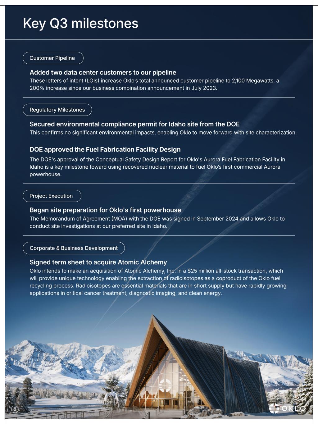 2 MICHAEL KLEIN Founder & Managing Partner of M. Klein & Company, Founder of Churchill Capital JACOB DEWITTE Co-founder, CEO, and Board of Directors Member CHRIS WRIGHT Founder & CEO of Liberty Energy, Inc. (NYSE: LBRT) LT. GEN (RET.) JOHN JANSEN United States Marine Corps RICHARD W. KINZLEY Former CFO of Black Hills Corporation (NYSE: BKH) CAROLINE COCHRAN Co-founder & COO of Oklo SAM ALTMAN Founder & CEO of OpenAI “We are entering an era of unprecedented energy demand—rivaled perhaps only by initial conversion to electrification over a century ago. The world is now recognizing nuclear’s role in powering that future. I’m confident we’ll look back on 2024 as the turning point in our mission to deliver clean, reliable, and affordable energy for all. Momentum is building every week—regulators are modernizing, bipartisan support is growing, and some of the most influential companies are investing heavily in the space. At Oklo, our focus on building small-scale, modern fission powerhouses—designed to be easily repeatable—along with our model of selling power directly to customers, allows us to accelerate timelines, reduce complexity, and scale to meet demand. With a site permit and secured fuel, we believe we’re poised to be a leader in deploying advanced nuclear by late 2027. As the world experiences an extraordinary transformation driven by AI, the future demands an equally bold solution for energy. We’re proud to lead the way.” WORLD-CLASS BOARD OF DIRECTORS