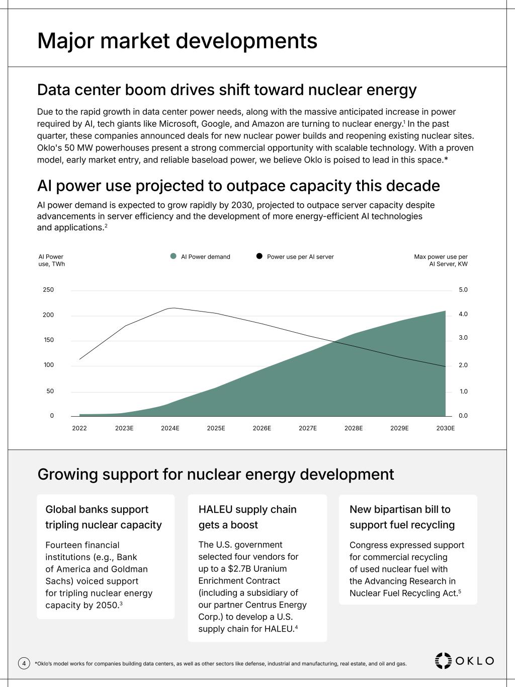 1. U.S. Department of Energy. U.S. Department of Energy Signs Off on Oklo Fuel Fabrication Facility Design Concept. Published October 15, 2024. Accessed October 31, 2024. https:// www.energy.gov/ne/articles/us-department-energy-signs-oklo-fuel-fabrication-facility- design-concept 2. Goldman Sachs. AI, data centers and the coming US power demand surge. Published April 28, 2024. Accessed October 31, 2024. https://www.goldmansachs.com/pdfs/insights/ pages/generational-growth-ai-data-centers-and-the-coming-us-power-surge/report.pdf 3. PR Newswire. 14 Major Global Banks and Financial Institutions Express Their Support for Effort to Triple Nuclear Energy by 2050. Published September 23, 2024. Accessed October 31, 2024. https://www.prnewswire.com/news-releases/14-major-global-banks- and-financial-institutions-express-their-support-for-effort-to-triple-nuclear-energy- by-2050-302255609.html 4. U.S. Department of Energy. Biden-Harris Administration Announces 6 Contracts to Spur America’s Domestic HALEU Supply Chain as Part of Investing in America Agenda. Published October 8, 2024. Accessed October 31, 2024. https://www.energy.gov/ne/articles/biden- harris-administration-announces-6-contracts-spur-americas-domestic-haleu-supply 5. U.S. Congress. S.5157 - Advancing Research in Nuclear Fuel Recycling Act of 2024. 118th Congress. Accessed October 31, 2024. https://www.congress.gov/bill/118th-congress/ senate-bill/5157 6. British Institute of Radiology. Important reports on supply of Medical Radioisotopes. Accessed November 12, 2024. https://www.bir.org.uk/media-centre/news/2013/april/ important-reports-on-supply-of-medical-radioisotopes.aspx#:~:text=Over%20the%20 last%20few%20years,You%20can%20view%20them%20here 7. World Nuclear News. China eyes expansion of radioisotope industry. Published November 6, 2024. Accessed November 12, 2024. https://www.world-nuclear-news.org/articles/china- eyes-expansion-of-radioisotope-industry 8. U.S. Department of Energy. U.S. Department of Energy Signs Off on Oklo Fuel Fabrication Facility Design Concept. Published October 15, 2024. Accessed October 31, 2024. https:// www.energy.gov/ne/articles/us-department-energy-signs-oklo-fuel-fabrication-facility- design-concept 9. U.S. Congress. S.1111 - ADVANCE Act of 2023. 118th Congress. Accessed October 31, 2024. https://www.congress.gov/bill/118th-congress/senate-bill/1111 10. U.S. Nuclear Regulatory Commission. Combined License Applications for New Reactors. Accessed October 31, 2024. https://www.nrc.gov/reactors/new-reactors/large-lwr/col.html 11. Utility Dive. NRC updates streamlined environmental review proposal for new nuclear reactors. Published October 9, 2024. Accessed October 30, 2024. https://www.utilitydive. com/news/nrc-streamlined-environmental-review-new-nuclear-reactors/729355/ 12. U.S. Nuclear Regulatory Commission. Preliminary White Paper – Nth-of-a-Kind Micro- Reactor Licensing and Deployment Considerations. Published September 2024. Accessed October 30, 2024. https://www.nrc.gov/docs/ML2426/ML24268A310.pdf#:~:text=The%20 micro-reactors%20considered%20in%20this%20paper CITATIONS 16