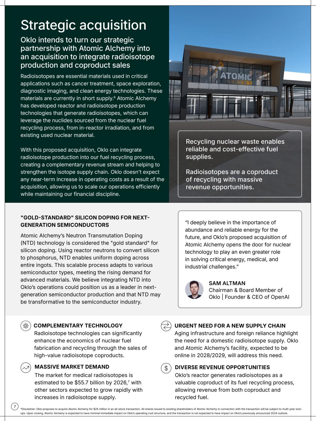 7 Radioisotopes are essential materials used in critical applications such as cancer treatment, space exploration, diagnostic imaging, and clean energy technologies. These materials are currently in short supply.6 Atomic Alchemy has developed reactor and radioisotope production technologies that generate radioisotopes, which can leverage the nuclides sourced from the nuclear fuel recycling process, from in-reactor irradiation, and from existing used nuclear material. With this proposed acquisition, Oklo can integrate radioisotope production into our fuel recycling process, creating a complementary revenue stream and helping to strengthen the isotope supply chain. Oklo doesn't expect any near-term increase in operating costs as a result of the acquisition, allowing us to scale our operations efficiently while maintaining our financial discipline. Strategic acquisition *Disclaimer: Oklo proposes to acquire Atomic Alchemy for $25 million in an all-stock transaction. All shares issued to existing shareholders of Atomic Alchemy in connection with the transaction will be subject to multi-year lock- ups. Upon closing, Atomic Alchemy is expected to have minimal immediate impact on Oklo’s operating cost structure, and the transaction is not expected to have impact on Oklo’s previously announced 2024 outlook. Oklo intends to turn our strategic partnership with Atomic Alchemy into an acquisition to integrate radioisotope production and coproduct sales COMPLEMENTARY TECHNOLOGY URGENT NEED FOR A NEW SUPPLY CHAIN Radioisotope technologies can significantly enhance the economics of nuclear fuel fabrication and recycling through the sales of high-value radioisotope coproducts. Aging infrastructure and foreign reliance highlight the need for a domestic radioisotope supply. Oklo and Atomic Alchemy’s facility, expected to be online in 2028/2029, will address this need. MASSIVE MARKET DEMAND DIVERSE REVENUE OPPORTUNITIES The market for medical radioisotopes is estimated to be $55.7 billion by 2026,7 with other sectors expected to grow rapidly with increases in radioisotope supply. Oklo’s reactor generates radioisotopes as a valuable coproduct of its fuel recycling process, allowing revenue from both coproduct and recycled fuel. Recycling nuclear waste enables reliable and cost-effective fuel supplies. Radioisotopes are a coproduct of recycling with massive revenue opportunities. Atomic Alchemy’s Neutron Transmutation Doping (NTD) technology is considered the "gold standard" for silicon doping. Using reactor neutrons to convert silicon to phosphorus, NTD enables uniform doping across entire ingots. This scalable process adapts to various semiconductor types, meeting the rising demand for advanced materials. We believe integrating NTD into Oklo’s operations could position us as a leader in next- generation semiconductor production and that NTD may be transformative to the semiconductor industry. "GOLD-STANDARD" SILICON DOPING FOR NEXT- GENERATION SEMICONDUCTORS SAM ALTMAN Chairman & Board Member of Oklo | Founder & CEO of OpenAI “I deeply believe in the importance of abundance and reliable energy for the future, and Oklo’s proposed acquisition of Atomic Alchemy opens the door for nuclear technology to play an even greater role in solving critical energy, medical, and industrial challenges.”