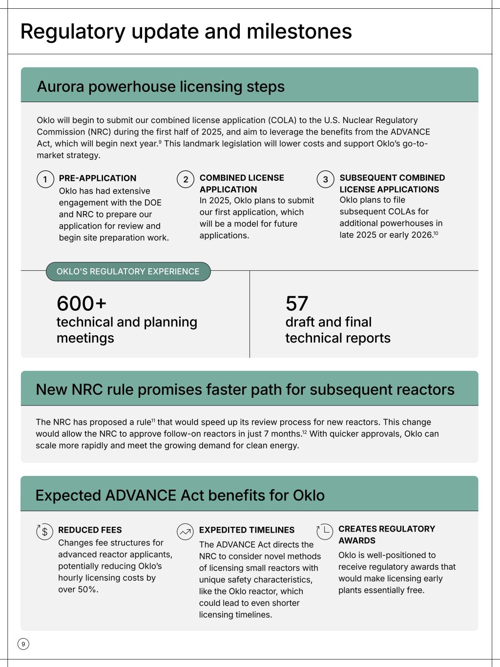9 New NRC rule promises faster path for subsequent reactors The NRC has proposed a rule11 that would speed up its review process for new reactors. This change would allow the NRC to approve follow-on reactors in just 7 months.12 With quicker approvals, Oklo can scale more rapidly and meet the growing demand for clean energy. Expected ADVANCE Act benefits for Oklo 1 REDUCED FEES Changes fee structures for advanced reactor applicants, potentially reducing Oklo’s hourly licensing costs by over 50%. EXPEDITED TIMELINES The ADVANCE Act directs the NRC to consider novel methods of licensing small reactors with unique safety characteristics, like the Oklo reactor, which could lead to even shorter licensing timelines. 2 CREATES REGULATORY AWARDS Oklo is well-positioned to receive regulatory awards that would make licensing early plants essentially free. 3 Regulatory update and milestones Oklo will begin to submit our combined license application (COLA) to the U.S. Nuclear Regulatory Commission (NRC) during the first half of 2025, and aim to leverage the benefits from the ADVANCE Act, which will begin next year.9 This landmark legislation will lower costs and support Oklo’s go-to- market strategy. Aurora powerhouse licensing steps 600+ technical and planning meetings 57 draft and final technical reports OKLO'S REGULATORY EXPERIENCE SUBSEQUENT COMBINED LICENSE APPLICATIONS COMBINED LICENSE APPLICATION Oklo plans to file subsequent COLAs for additional powerhouses in late 2025 or early 2026.10 In 2025, Oklo plans to submit our first application, which will be a model for future applications. PRE-APPLICATION Oklo has had extensive engagement with the DOE and NRC to prepare our application for review and begin site preparation work. 1 2 3