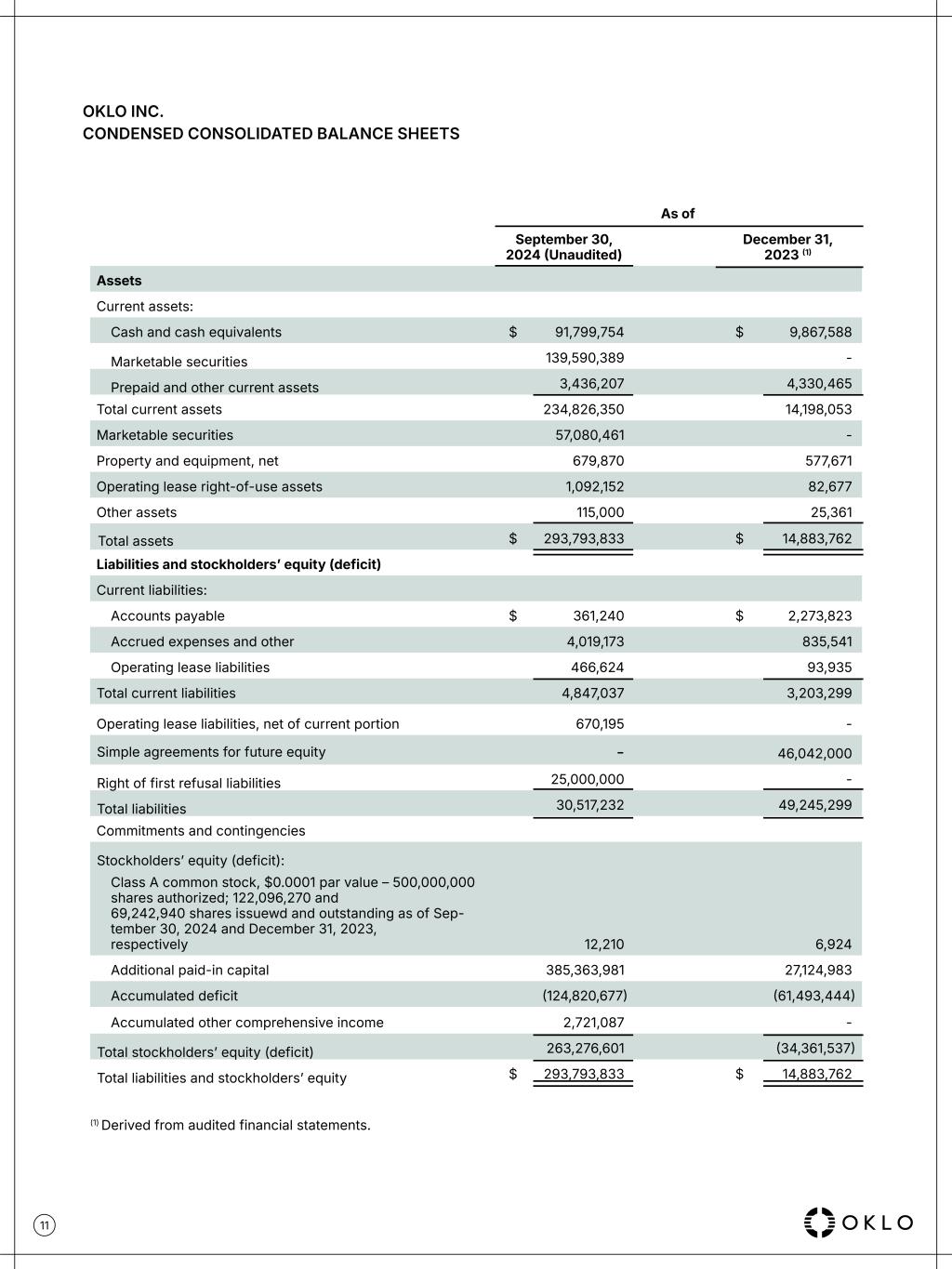 OKLO INC. CONDENSED CONSOLIDATED BALANCE SHEETS As of September 30, 2024 (Unaudited) December 31, 2023 (1) Assets Current assets: Cash and cash equivalents $ 91,799,754 $ 9,867,588 Marketable securities 139,590,389 - Prepaid and other current assets 3,436,207 4,330,465 Total current assets 234,826,350 14,198,053 Marketable securities 57,080,461 - Property and equipment, net 679,870 577,671 Operating lease right-of-use assets 1,092,152 82,677 Other assets 115,000 25,361 Total assets $ 293,793,833 $ 14,883,762 Liabilities and stockholders’ equity (deficit) Current liabilities: Accounts payable $ 361,240 $ 2,273,823 Accrued expenses and other 4,019,173 835,541 Operating lease liabilities 466,624 93,935 Total current liabilities 4,847,037 3,203,299 Operating lease liabilities, net of current portion 670,195 - Simple agreements for future equity - 46,042,000 Right of first refusal liabilities 25,000,000 - Total liabilities 30,517,232 49,245,299 Commitments and contingencies Stockholders’ equity (deficit): Class A common stock, $0.0001 par value – 500,000,000 shares authorized; 122,096,270 and 69,242,940 shares issuewd and outstanding as of Sep- tember 30, 2024 and December 31, 2023, respectively 12,210 6,924 Additional paid-in capital 385,363,981 27,124,983 Accumulated deficit (124,820,677) (61,493,444) Accumulated other comprehensive income 2,721,087 - Total stockholders’ equity (deficit) 263,276,601 (34,361,537) Total liabilities and stockholders’ equity $ 293,793,833 $ 14,883,762 11 (1) Derived from audited financial statements.