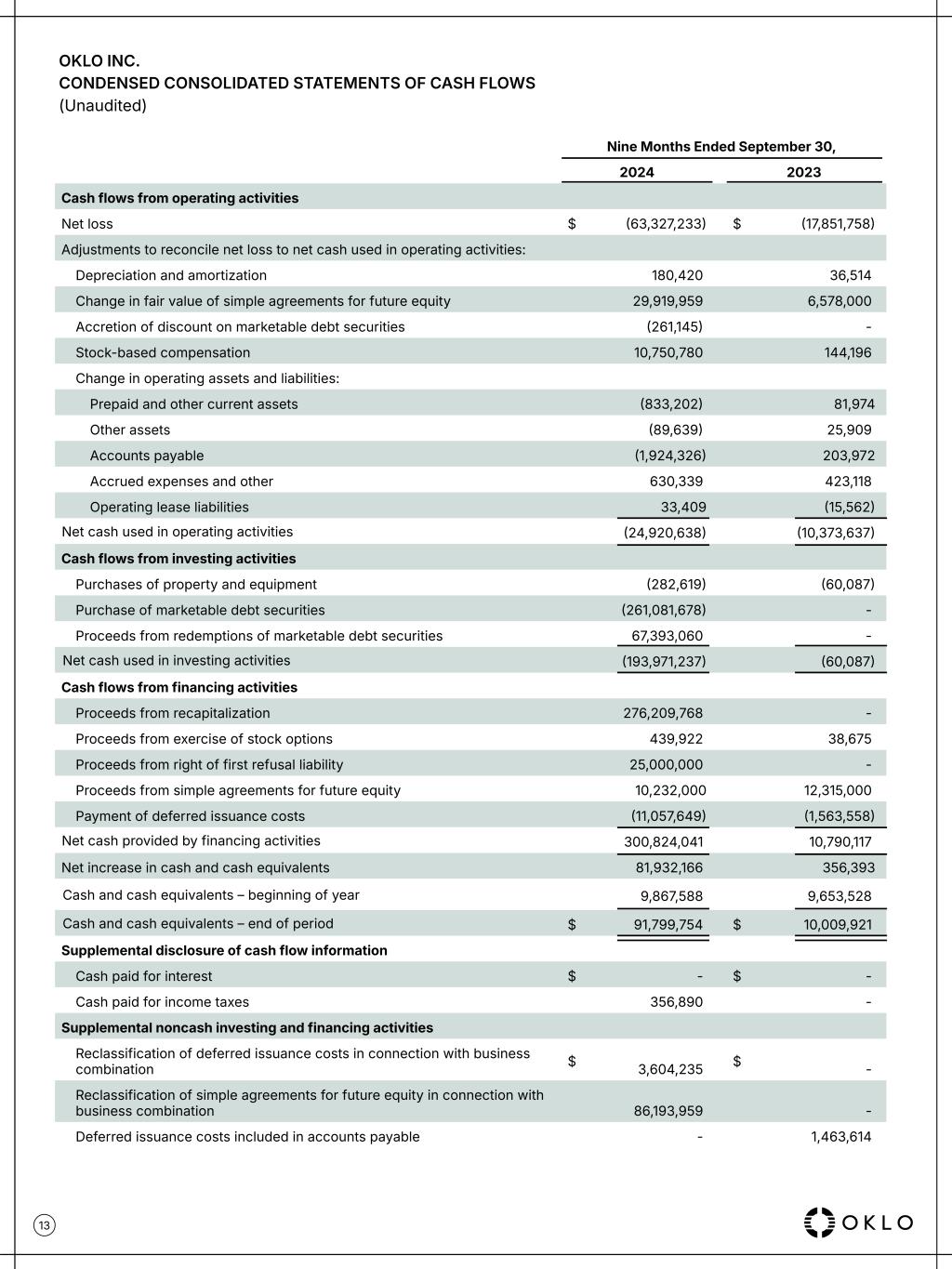 Nine Months Ended September 30, 2024 2023 Cash flows from operating activities Net loss $ (63,327,233) $ (17,851,758) Adjustments to reconcile net loss to net cash used in operating activities: Depreciation and amortization 180,420 36,514 Change in fair value of simple agreements for future equity 29,919,959 6,578,000 Accretion of discount on marketable debt securities (261,145) - Stock-based compensation 10,750,780 144,196 Change in operating assets and liabilities: Prepaid and other current assets (833,202) 81,974 Other assets (89,639) 25,909 Accounts payable (1,924,326) 203,972 Accrued expenses and other 630,339 423,118 Operating lease liabilities 33,409 (15,562) Net cash used in operating activities (24,920,638) (10,373,637) Cash flows from investing activities Purchases of property and equipment (282,619) (60,087) Purchase of marketable debt securities (261,081,678) - Proceeds from redemptions of marketable debt securities 67,393,060 - Net cash used in investing activities (193,971,237) (60,087) Cash flows from financing activities Proceeds from recapitalization 276,209,768 - Proceeds from exercise of stock options 439,922 38,675 Proceeds from right of first refusal liability 25,000,000 - Proceeds from simple agreements for future equity 10,232,000 12,315,000 Payment of deferred issuance costs (11,057,649) (1,563,558) Net cash provided by financing activities 300,824,041 10,790,117 Net increase in cash and cash equivalents 81,932,166 356,393 Cash and cash equivalents – beginning of year 9,867,588 9,653,528 Cash and cash equivalents – end of period $ 91,799,754 $ 10,009,921 Supplemental disclosure of cash flow information Cash paid for interest $ - $ - Cash paid for income taxes 356,890 - Supplemental noncash investing and financing activities Reclassification of deferred issuance costs in connection with business combination $ 3,604,235 $ - Reclassification of simple agreements for future equity in connection with business combination 86,193,959 - Deferred issuance costs included in accounts payable - 1,463,614 OKLO INC. CONDENSED CONSOLIDATED STATEMENTS OF CASH FLOWS (Unaudited) 13