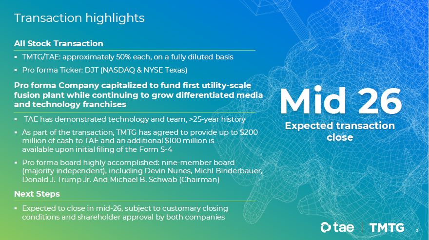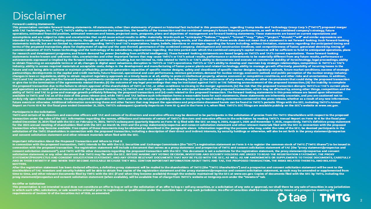 Disclaimer 2 Forward-Looking Statements This presentation contains forward-looking statements. All statements, other than statements of present or historical fact included in this presentation, regarding Trump Media and Technology Group Corp.’s (“TMTG”) proposed merger with TAE Technologies, Inc. (“TA E”), TMTG’s ability to consummate the transaction, the benefits o f the transactio n and the combined company’s future financial perfo rmance, as well as the combined company’s strategy, future operations, estimated financial position, estimated revenues and losses, projected costs, prospects, plans and objectives of management are forward-looking statements. These statements are based on current expectations and assumptio ns and are subject to risks and uncertainties that co uld cause actual results to differ materially. Words such as “anticipate,” “believe,” “expect,” “intend,” “may,” “plan,” “pro ject,” “should,” “will” and similar expressio ns are intended to identify forward-looking statements, though not all forward-looking statements contain these identifying words, and the absence of these words does not mean that a statement is not forward-looking. Such forward-looking statements include, but are no t limited to, statements regarding TMTG’s and TAE’s expectations, hopes, beliefs, intentio ns or strategies regarding the future including, without limitation, statements regarding: the anticipated timing and terms of the proposed transaction; plans for deployment of capital and the uses thereof; governance of the combined company; development and construction timelines; cost competitiveness of fusion-generated electricity; timing of commercialization of TA E’s fusion technology and the technology of its subsidiaries; expectations regarding the time period over which the combined company’s capital resources will be sufficient to fund its anticipated operations; plans for research and development programs; and future demand for power (including from artificial intelligence). These forward -looking statements are based largely on TMTG’s and TA E’s current expectations. These forward-looking statements invo lve k nown and unk nown risks, uncertainties and o ther important factors that may cause TMTG’s or TAE ’s actual results, performance or achievements to be materially different from any future results, performance or achievements expressed or implied by the forward-looking statements, including, but no t limited to, risks related to TMTG ’s or TAE ’s ability to demonstrate and execute on commercial viability of its technology; legal proceedings; ability to obtain financing on acceptable terms or at all; changes in digital asset valuations; disruption to TMTG’s or TAE’s operations; TMTG’s or TAE’s ability to develop and maintain k ey strategic relationships; competition in TMTG’s o r TAE ’s industry; ability to access required materials at acceptable costs; delays in the development and manufacturing of fusion power plants and related technology; ability to manage growth effectively; possibility of incurring losses in the future and not being able to achieve or maintain profitability; potential generation capacities of specific reactor designs; safety and cleanliness of specific reactor designs; regulatory outlook; future market conditions; success of strategic partnerships; developments in the capital and credit markets; future financial, operational and cost performance; revenue gen eration; demand for nuclear energy; economic outlook and public perception of the nuclear energy industry; changes in laws or regulations; ability to obtain required regulatory approvals on a timely basis or at all; ability to prote ct intellectual property; adverse economic or competitive conditions; and other risks and uncertainties. In addition, TMTG and TAE caution you that the forward-looking statements contained in this presentation are subject to the following factors : (i) the occurrence of any event, change or other circumstances that could delay the proposed transaction or give rise to the termination of the agreements related thereto; (ii) the outcome of any legal proceedings that may be inst ituted against TMTG or TAE following announcement of the proposed transaction; (iii) the inability to complete the proposed transaction due to the failure to obtain approval of the shareholders of TMTG or TAE, or other conditions to closing in the merger agreement; (iv) the risk that the proposed transactio n disrupts TMTG’s o r TAE ’s current plans and operations as a result of the announcement of the proposed transaction; (v) TMTG’s and TA E’s ability to realize the antic ipated benefits of the proposed transaction, which may be affected by, among other things, competition and the ability of TMTG and TAE to grow and manage growth profitably following the proposed transaction; and (vi) costs related to th e proposed transaction. The forward-looking statements in this press release are based upon information available to TMTG and TAE as of the date of this press release and, while TMTG and TAE believe such information forms a reasonable basis for such statements, these statements are inherently uncertain, and you are cautioned not to unduly rely upon these statements. Except as required by applicable law, TMTG and TAE do not plan to publicly update or revise any forward-looking statements contained in this press release, whether as a result of any new information, future events or otherwise. Additional information concerning these and other factors that may impact the operations and proj ections discussed herein can be found in TMTG ’s periodic filings with the SEC, including TMTG’s Annual Report on Form 10-K for the fiscal year ended December 31, 2024, TMTG’s subsequent Quarterly Repo rts on Form 10 -Q and in the Form S-4, when filed. TMTG’s SEC filings are available publicly on the SEC’s website at www.sec