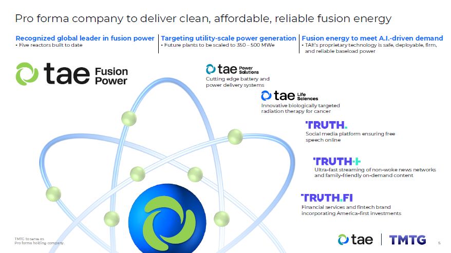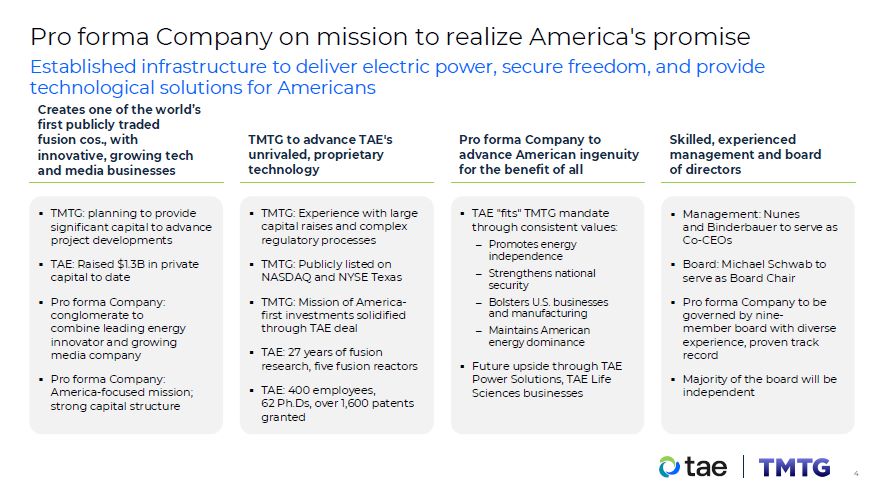 TMTG: Experience with large capital raises and complex regulatory processes  TMTG: Publicly listed on NASDAQ and NYSE Texas  TMTG: Mission of America-first investments solidified through TAE deal  TAE: 27 years of fusion research, five fusion reactors  TAE: 400 employees,  62 Ph.Ds, over 1,600 patents  granted  TAE "fits" TMTG mandate through consistent values:  Promotes energy independence  Strengthens national  security  Bolsters U.S. businesses and manufacturing  Maintains American  energy dominance  Future upside through TAE Power Solutions, TAE Life Sciences businesses  TMTG: planning to provide significant capital to advance project developments  TAE: Raised $1.3B in private capital to date  Pro forma Company: conglomerate to combine leading energy innovator and growing media company  Pro forma Company: America-focused mission; strong capital structure  Pro forma Company on mission to realize America's promise  Management: Nunes  and Binderbauer to serve as  Co-CEOs  Board: Michael Schwab to serve as Board Chair  Pro forma Company to be  governed by nine-  member board with diverse experience, proven track record  Majority of the board will be  independent  TMTG to advance TAE's unrivaled, proprietary technology  Pro forma Company to advance American ingenuity for the benefit of all  Established infrastructure to deliver electric power, secure freedom, and provide  technological solutions for Americans  Creates one of the world’s  first publicly traded  fusion cos., with innovative, growing tech and media businesses  Skilled, experienced management and board of directors  4