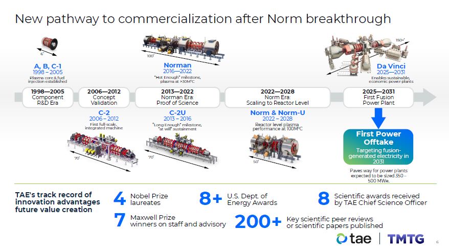 New pathway to commercialization after Norm breakthrough  2025—2031  First Fusion  Power Plant  1998—2005  Component  R&D Era  A, B, C-1  1998 – 2005  Plasma core & fuel  injection established  6’  2006—2012  Concept  Validation  C-2  2006 – 2012  First full-scale,  integrated machine  70’  100’  Norman  2016—2022  “Hot Enough” milestone,  plasma at >30M°C  2013—2022  Norman Era:  Proof of Science  C-2U  2013 – 2016  “Long Enough” milestone,  ”at will” sustainment  70’  2022—2028  Norm Era:  Scaling to Reactor Level  Norm & Norm-U  2022 – 2028  Reactor level plasma  performance at 100M°C  50’  Da Vinci  2025—2031  Enables sustainable,  economic power plants  150+’  First Power  Offtake  TAE's track record of innovation advantages future value creation  4  7  Nobel Prize laureates  Maxwell Prize  winners on staff and advisory  Scientific awards received  8 by TAE Chief Science Officer  Key scientific peer reviews  200+ or scientific papers published  8+  U.S. Dept. of Energy Awards  Targeting fusion-generated electricity in 2031  Paves way for power plants expected to be sized 350 – 500 MWe.  10