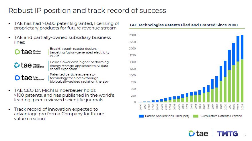 Robust IP position and track record of success  0  250  500  750  1000  1250  1500  1750  2000  2250  2500  2000  2001  2002  2003  2004  2005  2006  2007  2008  2009  2010  2011  2012  2013  2014  2015  2016  2017  2018  2019  2020  2021  2022  2023  2024  TAE has had >1,600 patents granted, licensing of proprietary products for future revenue stream  TAE and partially-owned subsidiary business lines:  Breakthrough reactor design; targeting fusion-generated electricity in 2031  Deliver lower cost, higher performing energy storage, applicable to AI-data center expansion  Patented particle accelerator technology for a breakthrough biologically-guided radiation therapy  TAE CEO Dr. Michl Binderbauer holds  >100 patents, and has published in the world’s  leading, peer-reviewed scientific journals  Track record of innovation expected to advantage pro forma Company for future value creation  TAE Technologies Patents Filed and Granted Since 2000  Cumulative Patents Granted  Patent Applications Filed (net)  10