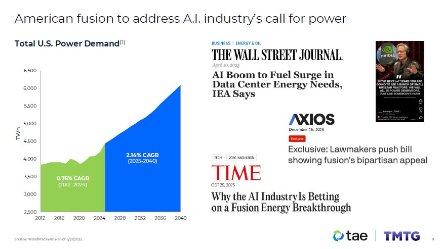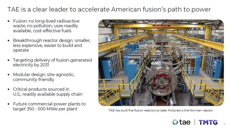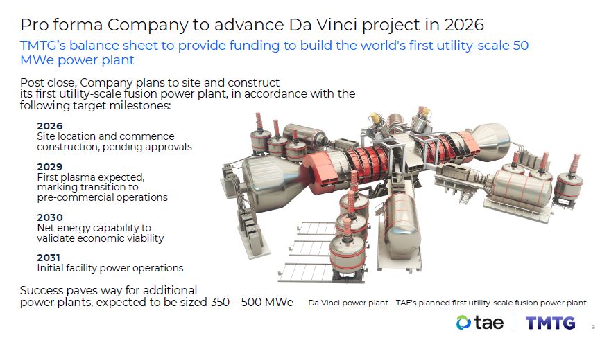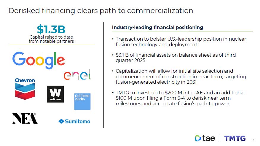 Derisked financing clears path to commercialization  Transaction to bolster U.S.-leadership position in nuclear fusion technology and deployment  $3.1 B of financial assets on balance sheet as of third quarter 2025  Capitalization will allow for initial site selection and commencement of construction in near-term, targeting fusion-generated electricity in 2031  TMTG to invest up to $200 M into TAE and an additional  $100 M upon filing a Form S-4 to derisk near term  milestones and accelerate fusion’s path to power  $1.3B  Capital raised to date from notable partners  Industry-leading financial positioning  10