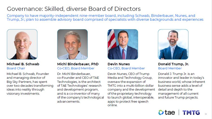 Company to have majority-independent nine-member board, including Schwab, Binderbauer, Nunes, and Trump, Jr.; plan to assemble advisory board comprised of specialists with diverse backgrounds and experiences  Governance: Skilled, diverse Board of Directors  Michael B. Schwab  Board Chair  Michael B. Schwab, Founder and managing director of Big Sky Partners, has spent  over two decades transforming ideas into reality through visionary investments.  Michl Binderbauer, PhD  Co-CEO, Board Member  Dr. Michl Binderbauer,  co-Founder and CEO of TAE Technologies, is the architect of TAE Technologies’ research and development program, and is a co-inventor of many  of the company’s technological  advancements.  Donald Trump, Jr.  Board Member  Donald J. Trump Jr. is an innovator and leader in today’s business world, whose inherent business sense adds a level of detail and depth to the management of all current and future Trump projects.  Devin Nunes  Co-CEO, Board Member  Devin Nunes, CEO of Trump Media and Technology Group, oversaw the expansion of TMTG into a multi-billion dollar  company and the development of the proprietary technology to launch global, interoperable, apps to protect free speech online.  12
