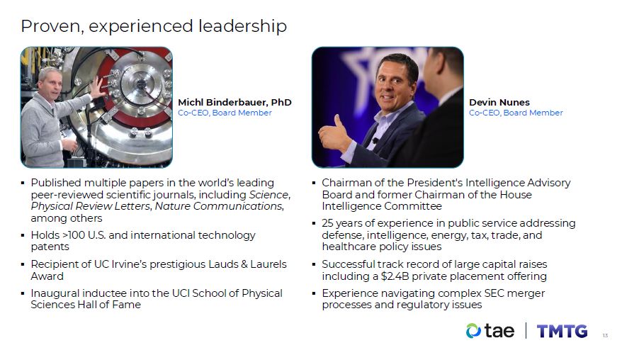 Proven, experienced leadership  Michl Binderbauer, PhD  Co-CEO, Board Member  Devin Nunes  Co-CEO, Board Member  Chairman of the President's Intelligence Advisory Board and former Chairman of the House Intelligence Committee  25 years of experience in public service addressing defense, intelligence, energy, tax, trade, and healthcare policy issues  Successful track record of large capital raises including a $2.4B private placement offering  Experience navigating complex SEC merger processes and regulatory issues  Published multiple papers in the world’s leading peer-reviewed scientific journals, including Science, Physical Review Letters, Nature Communications, among others  Holds >100 U.S. and international technology patents  Recipient of UC Irvine’s prestigious Lauds & Laurels  Award  Inaugural inductee into the UCI School of Physical Sciences Hall of Fame  12