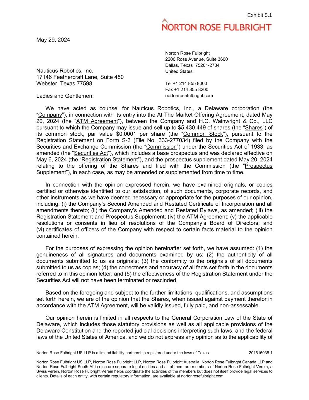 Norton Rose Fulbright US LLP is a limited liability partnership registered under the laws of Texas. 201616035.1 Norton Rose Fulbright US LLP, Norton Rose Fulbright LLP, Norton Rose Fulbright Australia, Norton Rose Fulbright Canada LLP and Norton Rose Fulbright South Africa Inc are separate legal entities and all of them are members of Norton Rose Fulbright Verein, a Swiss verein. Norton Rose Fulbright Verein helps coordinate the activities of the members but does not itself provide legal services to clients. Details of each entity, with certain regulatory information, are available at nortonrosefulbright.com. Norton Rose Fulbright 2200 Ross Avenue, Suite 3600 Dallas, Texas 75201-2784 United States Tel +1 214 855 8000 Fax +1 214 855 8200 nortonrosefulbright.com May 29, 2024 Nauticus Robotics, Inc. 17146 Feathercraft Lane, Suite 450 Webster, Texas 77598 Ladies and Gentlemen: We have acted as counsel for Nauticus Robotics, Inc., a Delaware corporation (the “Company”), in connection with its entry into the At The Market Offering Agreement, dated May 20, 2024 (the “ATM Agreement”), between the Company and H.C. Wainwright & Co., LLC pursuant to which the Company may issue and sell up to $5,430,449 of shares (the “Shares”) of its common stock, par value $0.0001 per share (the “Common Stock”), pursuant to the Registration Statement on Form S-3 (File No. 333-277034) filed by the Company with the Securities and Exchange Commission (the “Commission”) under the Securities Act of 1933, as amended (the “Securities Act”), which includes a base prospectus and was declared effective on May 6, 2024 (the “Registration Statement”), and the prospectus supplement dated May 20, 2024 relating to the offering of the Shares and filed with the Commission (the “Prospectus Supplement”), in each case, as may be amended or supplemented from time to time. In connection with the opinion expressed herein, we have examined originals, or copies certified or otherwise identified to our satisfaction, of such documents, corporate records, and other instruments as we have deemed necessary or appropriate for the purposes of our opinion, including: (i) the Company’s Second Amended and Restated Certificate of Incorporation and all amendments thereto; (ii) the Company’s Amended and Restated Bylaws, as amended; (iii) the Registration Statement and Prospectus Supplement; (iv) the ATM Agreement; (v) the applicable resolutions or consents in lieu of resolutions of the Company’s Board of Directors; and (vi) certificates of officers of the Company with respect to certain facts material to the opinion contained herein. For the purposes of expressing the opinion hereinafter set forth, we have assumed: (1) the genuineness of all signatures and documents examined by us; (2) the authenticity of all documents submitted to us as originals; (3) the conformity to the originals of all documents submitted to us as copies; (4) the correctness and accuracy of all facts set forth in the documents referred to in this opinion letter; and (5) the effectiveness of the Registration Statement under the Securities Act will not have been terminated or rescinded. Based on the foregoing and subject to the further limitations, qualifications, and assumptions set forth herein, we are of the opinion that the Shares, when issued against payment therefor in accordance with the ATM Agreement, will be validly issued, fully paid, and non-assessable. Our opinion herein is limited in all respects to the General Corporation Law of the State of Delaware, which includes those statutory provisions as well as all applicable provisions of the Delaware Constitution and the reported judicial decisions interpreting such laws, and the federal laws of the United States of America, and we do not express any opinion as to the applicability of