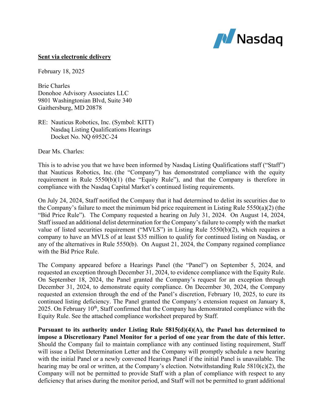 Sent via electronic delivery February 18, 2025 Brie Charles Donohoe Advisory Associates LLC 9801 Washingtonian Blvd, Suite 340 Gaithersburg, MD 20878 RE: Nauticus Robotics, Inc. (Symbol: KITT) Nasdaq Listing Qualifications Hearings Docket No. NQ 6952C-24 Dear Ms. Charles: This is to advise you that we have been informed by Nasdaq Listing Qualifications staff (“Staff”) that Nauticus Robotics, Inc. (the “Company”) has demonstrated compliance with the equity requirement in Rule 5550(b)(1) (the “Equity Rule”), and that the Company is therefore in compliance with the Nasdaq Capital Market’s continued listing requirements. On July 24, 2024, Staff notified the Company that it had determined to delist its securities due to the Company’s failure to meet the minimum bid price requirement in Listing Rule 5550(a)(2) (the “Bid Price Rule”). The Company requested a hearing on July 31, 2024. On August 14, 2024, Staff issued an additional delist determination for the Company’s failure to comply with the market value of listed securities requirement (“MVLS”) in Listing Rule 5550(b)(2), which requires a company to have an MVLS of at least $35 million to qualify for continued listing on Nasdaq, or any of the alternatives in Rule 5550(b). On August 21, 2024, the Company regained compliance with the Bid Price Rule. The Company appeared before a Hearings Panel (the “Panel”) on September 5, 2024, and requested an exception through December 31, 2024, to evidence compliance with the Equity Rule. On September 18, 2024, the Panel granted the Company’s request for an exception through December 31, 2024, to demonstrate equity compliance. On December 30, 2024, the Company requested an extension through the end of the Panel’s discretion, February 10, 2025, to cure its continued listing deficiency. The Panel granted the Company’s extension request on January 8, 2025. On February 10th, Staff confirmed that the Company has demonstrated compliance with the Equity Rule. See the attached compliance worksheet prepared by Staff. Pursuant to its authority under Listing Rule 5815(d)(4)(A), the Panel has determined to impose a Discretionary Panel Monitor for a period of one year from the date of this letter. Should the Company fail to maintain compliance with any continued listing requirement, Staff will issue a Delist Determination Letter and the Company will promptly schedule a new hearing with the initial Panel or a newly convened Hearings Panel if the initial Panel is unavailable. The hearing may be oral or written, at the Company’s election. Notwithstanding Rule 5810(c)(2), the Company will not be permitted to provide Staff with a plan of compliance with respect to any deficiency that arises during the monitor period, and Staff will not be permitted to grant additional