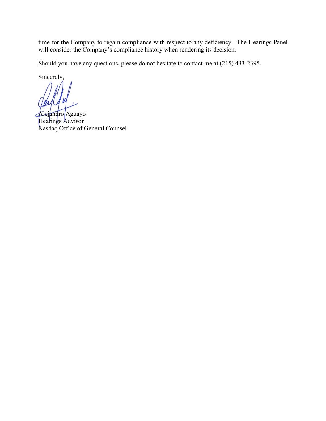time for the Company to regain compliance with respect to any deficiency. The Hearings Panel will consider the Company’s compliance history when rendering its decision. Should you have any questions, please do not hesitate to contact me at (215) 433-2395. Sincerely, Alejandro Aguayo Hearings Advisor Nasdaq Office of General Counsel