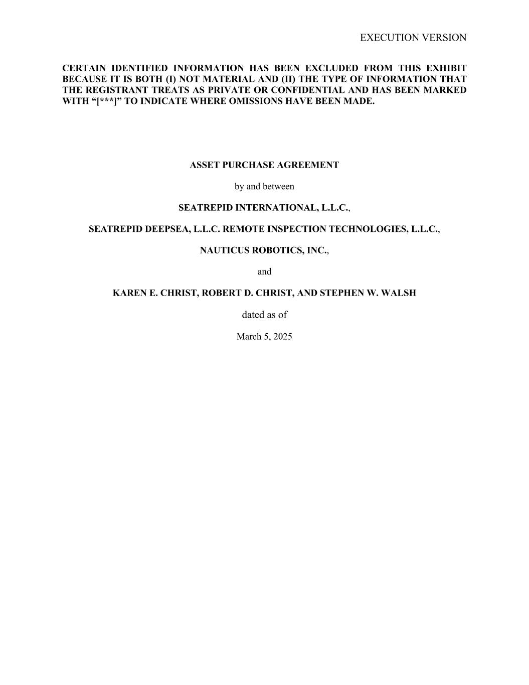 EXECUTION VERSION CERTAIN IDENTIFIED INFORMATION HAS BEEN EXCLUDED FROM THIS EXHIBIT BECAUSE IT IS BOTH (I) NOT MATERIAL AND (II) THE TYPE OF INFORMATION THAT THE REGISTRANT TREATS AS PRIVATE OR CONFIDENTIAL AND HAS BEEN MARKED WITH “[***]” TO INDICATE WHERE OMISSIONS HAVE BEEN MADE. ASSET PURCHASE AGREEMENT by and between SEATREPID INTERNATIONAL, L.L.C., SEATREPID DEEPSEA, L.L.C. REMOTE INSPECTION TECHNOLOGIES, L.L.C., NAUTICUS ROBOTICS, INC., and KAREN E. CHRIST, ROBERT D. CHRIST, AND STEPHEN W. WALSH dated as of March 5, 2025