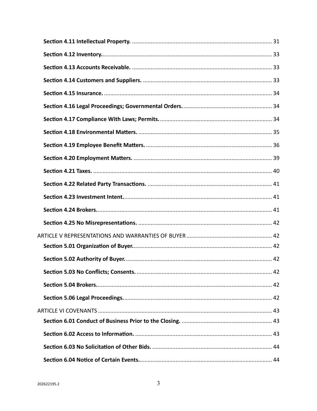 202622195.2 3 Section 4.11 Intellectual Property. .......................................................................................... 31 Section 4.12 Inventory. ............................................................................................................. 33 Section 4.13 Accounts Receivable. .......................................................................................... 33 Section 4.14 Customers and Suppliers. ................................................................................... 33 Section 4.15 Insurance. ............................................................................................................ 34 Section 4.16 Legal Proceedings; Governmental Orders. ......................................................... 34 Section 4.17 Compliance With Laws; Permits. ........................................................................ 34 Section 4.18 Environmental Matters. ...................................................................................... 35 Section 4.19 Employee Benefit Matters. ................................................................................. 36 Section 4.20 Employment Matters. ......................................................................................... 39 Section 4.21 Taxes. ................................................................................................................... 40 Section 4.22 Related Party Transactions. ................................................................................ 41 Section 4.23 Investment Intent. ............................................................................................... 41 Section 4.24 Brokers. ................................................................................................................ 41 Section 4.25 No Misrepresentations. ...................................................................................... 42 ARTICLE V REPRESENTATIONS AND WARRANTIES OF BUYER ....................................................... 42 Section 5.01 Organization of Buyer. ......................................................................................... 42 Section 5.02 Authority of Buyer. .............................................................................................. 42 Section 5.03 No Conflicts; Consents. ....................................................................................... 42 Section 5.04 Brokers. ................................................................................................................ 42 Section 5.06 Legal Proceedings. ............................................................................................... 42 ARTICLE VI COVENANTS ................................................................................................................ 43 Section 6.01 Conduct of Business Prior to the Closing. .......................................................... 43 Section 6.02 Access to Information. ........................................................................................ 43 Section 6.03 No Solicitation of Other Bids. ............................................................................. 44 Section 6.04 Notice of Certain Events...................................................................................... 44