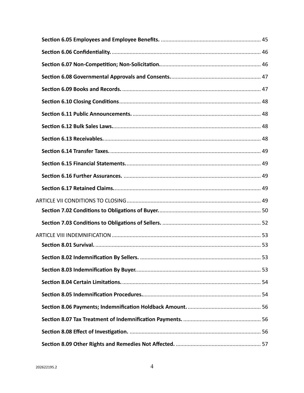 202622195.2 4 Section 6.05 Employees and Employee Benefits. ................................................................... 45 Section 6.06 Confidentiality. .................................................................................................... 46 Section 6.07 Non-Competition; Non-Solicitation. ................................................................... 46 Section 6.08 Governmental Approvals and Consents. ............................................................ 47 Section 6.09 Books and Records. ............................................................................................. 47 Section 6.10 Closing Conditions ............................................................................................... 48 Section 6.11 Public Announcements. ...................................................................................... 48 Section 6.12 Bulk Sales Laws.................................................................................................... 48 Section 6.13 Receivables. ......................................................................................................... 48 Section 6.14 Transfer Taxes. ..................................................................................................... 49 Section 6.15 Financial Statements. .......................................................................................... 49 Section 6.16 Further Assurances. ............................................................................................ 49 Section 6.17 Retained Claims. .................................................................................................. 49 ARTICLE VII CONDITIONS TO CLOSING .......................................................................................... 49 Section 7.02 Conditions to Obligations of Buyer. .................................................................... 50 Section 7.03 Conditions to Obligations of Sellers. .................................................................. 52 ARTICLE VIII INDEMNIFICATION .................................................................................................... 53 Section 8.01 Survival. ............................................................................................................... 53 Section 8.02 Indemnification By Sellers. ................................................................................. 53 Section 8.03 Indemnification By Buyer. ................................................................................... 53 Section 8.04 Certain Limitations. ............................................................................................. 54 Section 8.05 Indemnification Procedures. ............................................................................... 54 Section 8.06 Payments; Indemnification Holdback Amount. ................................................. 56 Section 8.07 Tax Treatment of Indemnification Payments. .................................................... 56 Section 8.08 Effect of Investigation. ........................................................................................ 56 Section 8.09 Other Rights and Remedies Not Affected. ......................................................... 57