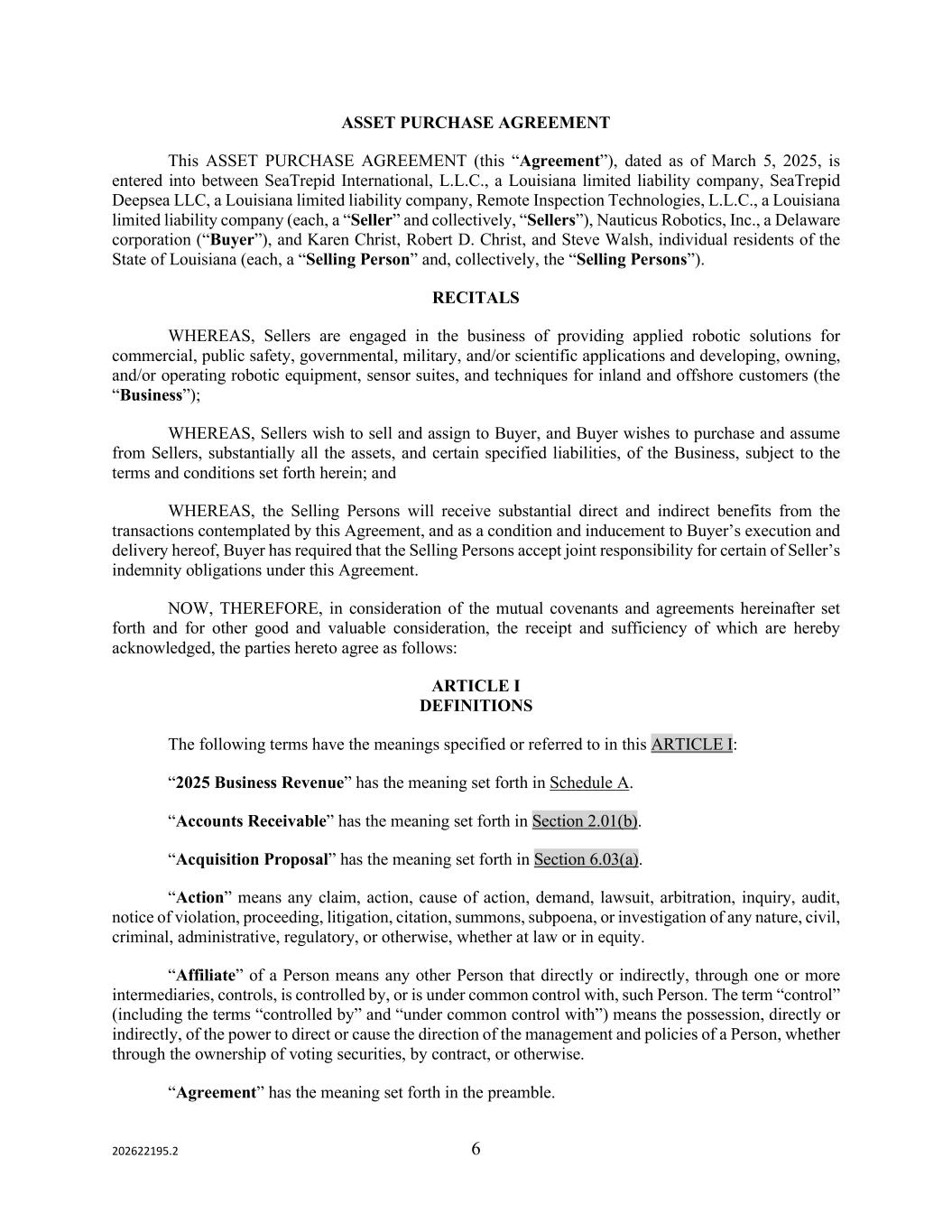 202622195.2 6 ASSET PURCHASE AGREEMENT This ASSET PURCHASE AGREEMENT (this “Agreement”), dated as of March 5, 2025, is entered into between SeaTrepid International, L.L.C., a Louisiana limited liability company, SeaTrepid Deepsea LLC, a Louisiana limited liability company, Remote Inspection Technologies, L.L.C., a Louisiana limited liability company (each, a “Seller” and collectively, “Sellers”), Nauticus Robotics, Inc., a Delaware corporation (“Buyer”), and Karen Christ, Robert D. Christ, and Steve Walsh, individual residents of the State of Louisiana (each, a “Selling Person” and, collectively, the “Selling Persons”). RECITALS WHEREAS, Sellers are engaged in the business of providing applied robotic solutions for commercial, public safety, governmental, military, and/or scientific applications and developing, owning, and/or operating robotic equipment, sensor suites, and techniques for inland and offshore customers (the “Business”); WHEREAS, Sellers wish to sell and assign to Buyer, and Buyer wishes to purchase and assume from Sellers, substantially all the assets, and certain specified liabilities, of the Business, subject to the terms and conditions set forth herein; and WHEREAS, the Selling Persons will receive substantial direct and indirect benefits from the transactions contemplated by this Agreement, and as a condition and inducement to Buyer’s execution and delivery hereof, Buyer has required that the Selling Persons accept joint responsibility for certain of Seller’s indemnity obligations under this Agreement. NOW, THEREFORE, in consideration of the mutual covenants and agreements hereinafter set forth and for other good and valuable consideration, the receipt and sufficiency of which are hereby acknowledged, the parties hereto agree as follows: ARTICLE I DEFINITIONS The following terms have the meanings specified or referred to in this ARTICLE I: “2025 Business Revenue” has the meaning set forth in Schedule A. “Accounts Receivable” has the meaning set forth in Section 2.01(b). “Acquisition Proposal” has the meaning set forth in Section 6.03(a). “Action” means any claim, action, cause of action, demand, lawsuit, arbitration, inquiry, audit, notice of violation, proceeding, litigation, citation, summons, subpoena, or investigation of any nature, civil, criminal, administrative, regulatory, or otherwise, whether at law or in equity. “Affiliate” of a Person means any other Person that directly or indirectly, through one or more intermediaries, controls, is controlled by, or is under common control with, such Person. The term “control” (including the terms “controlled by” and “under common control with”) means the possession, directly or indirectly, of the power to direct or cause the direction of the management and policies of a Person, whether through the ownership of voting securities, by contract, or otherwise. “Agreement” has the meaning set forth in the preamble.