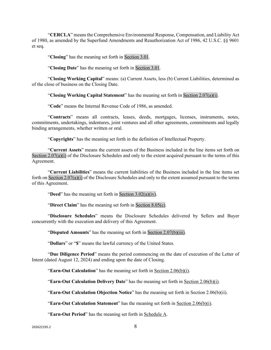 202622195.2 8 “CERCLA” means the Comprehensive Environmental Response, Compensation, and Liability Act of 1980, as amended by the Superfund Amendments and Reauthorization Act of 1986, 42 U.S.C. §§ 9601 et seq. “Closing” has the meaning set forth in Section 3.01. “Closing Date” has the meaning set forth in Section 3.01. “Closing Working Capital” means: (a) Current Assets, less (b) Current Liabilities, determined as of the close of business on the Closing Date. “Closing Working Capital Statement” has the meaning set forth in Section 2.07(a)(i). “Code” means the Internal Revenue Code of 1986, as amended. “Contracts” means all contracts, leases, deeds, mortgages, licenses, instruments, notes, commitments, undertakings, indentures, joint ventures and all other agreements, commitments and legally binding arrangements, whether written or oral. “Copyrights” has the meaning set forth in the definition of Intellectual Property. “Current Assets” means the current assets of the Business included in the line items set forth on Section 2.07(a)(i) of the Disclosure Schedules and only to the extent acquired pursuant to the terms of this Agreement. “Current Liabilities” means the current liabilities of the Business included in the line items set forth on Section 2.07(a)(i) of the Disclosure Schedules and only to the extent assumed pursuant to the terms of this Agreement. “Deed” has the meaning set forth in Section 3.02(a)(iv). “Direct Claim” has the meaning set forth in Section 8.05(c). “Disclosure Schedules” means the Disclosure Schedules delivered by Sellers and Buyer concurrently with the execution and delivery of this Agreement. “Disputed Amounts” has the meaning set forth in Section 2.07(b)(iii). “Dollars” or “$” means the lawful currency of the United States. “Due Diligence Period” means the period commencing on the date of execution of the Letter of Intent (dated August 12, 2024) and ending upon the date of Closing. “Earn-Out Calculation” has the meaning set forth in Section 2.06(b)(i). “Earn-Out Calculation Delivery Date” has the meaning set forth in Section 2.06(b)(i). “Earn-Out Calculation Objection Notice” has the meaning set forth in Section 2.06(b)(ii). “Earn-Out Calculation Statement” has the meaning set forth in Section 2.06(b)(i). “Earn-Out Period” has the meaning set forth in Schedule A.
