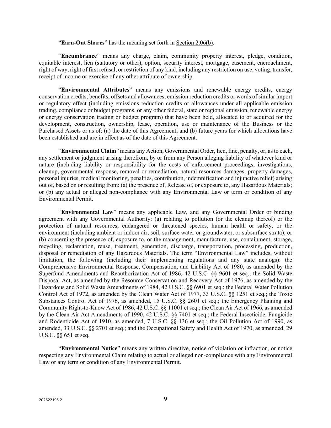 202622195.2 9 “Earn-Out Shares” has the meaning set forth in Section 2.06(b). “Encumbrance” means any charge, claim, community property interest, pledge, condition, equitable interest, lien (statutory or other), option, security interest, mortgage, easement, encroachment, right of way, right of first refusal, or restriction of any kind, including any restriction on use, voting, transfer, receipt of income or exercise of any other attribute of ownership. “Environmental Attributes” means any emissions and renewable energy credits, energy conservation credits, benefits, offsets and allowances, emission reduction credits or words of similar import or regulatory effect (including emissions reduction credits or allowances under all applicable emission trading, compliance or budget programs, or any other federal, state or regional emission, renewable energy or energy conservation trading or budget program) that have been held, allocated to or acquired for the development, construction, ownership, lease, operation, use or maintenance of the Business or the Purchased Assets or as of: (a) the date of this Agreement; and (b) future years for which allocations have been established and are in effect as of the date of this Agreement. “Environmental Claim” means any Action, Governmental Order, lien, fine, penalty, or, as to each, any settlement or judgment arising therefrom, by or from any Person alleging liability of whatever kind or nature (including liability or responsibility for the costs of enforcement proceedings, investigations, cleanup, governmental response, removal or remediation, natural resources damages, property damages, personal injuries, medical monitoring, penalties, contribution, indemnification and injunctive relief) arising out of, based on or resulting from: (a) the presence of, Release of, or exposure to, any Hazardous Materials; or (b) any actual or alleged non-compliance with any Environmental Law or term or condition of any Environmental Permit. “Environmental Law” means any applicable Law, and any Governmental Order or binding agreement with any Governmental Authority: (a) relating to pollution (or the cleanup thereof) or the protection of natural resources, endangered or threatened species, human health or safety, or the environment (including ambient or indoor air, soil, surface water or groundwater, or subsurface strata); or (b) concerning the presence of, exposure to, or the management, manufacture, use, containment, storage, recycling, reclamation, reuse, treatment, generation, discharge, transportation, processing, production, disposal or remediation of any Hazardous Materials. The term “Environmental Law” includes, without limitation, the following (including their implementing regulations and any state analogs): the Comprehensive Environmental Response, Compensation, and Liability Act of 1980, as amended by the Superfund Amendments and Reauthorization Act of 1986, 42 U.S.C. §§ 9601 et seq.; the Solid Waste Disposal Act, as amended by the Resource Conservation and Recovery Act of 1976, as amended by the Hazardous and Solid Waste Amendments of 1984, 42 U.S.C. §§ 6901 et seq.; the Federal Water Pollution Control Act of 1972, as amended by the Clean Water Act of 1977, 33 U.S.C. §§ 1251 et seq.; the Toxic Substances Control Act of 1976, as amended, 15 U.S.C. §§ 2601 et seq.; the Emergency Planning and Community Right-to-Know Act of 1986, 42 U.S.C. §§ 11001 et seq.; the Clean Air Act of 1966, as amended by the Clean Air Act Amendments of 1990, 42 U.S.C. §§ 7401 et seq.; the Federal Insecticide, Fungicide and Rodenticide Act of 1910, as amended, 7 U.S.C. §§ 136 et seq.; the Oil Pollution Act of 1990, as amended, 33 U.S.C. §§ 2701 et seq.; and the Occupational Safety and Health Act of 1970, as amended, 29 U.S.C. §§ 651 et seq. “Environmental Notice” means any written directive, notice of violation or infraction, or notice respecting any Environmental Claim relating to actual or alleged non-compliance with any Environmental Law or any term or condition of any Environmental Permit.