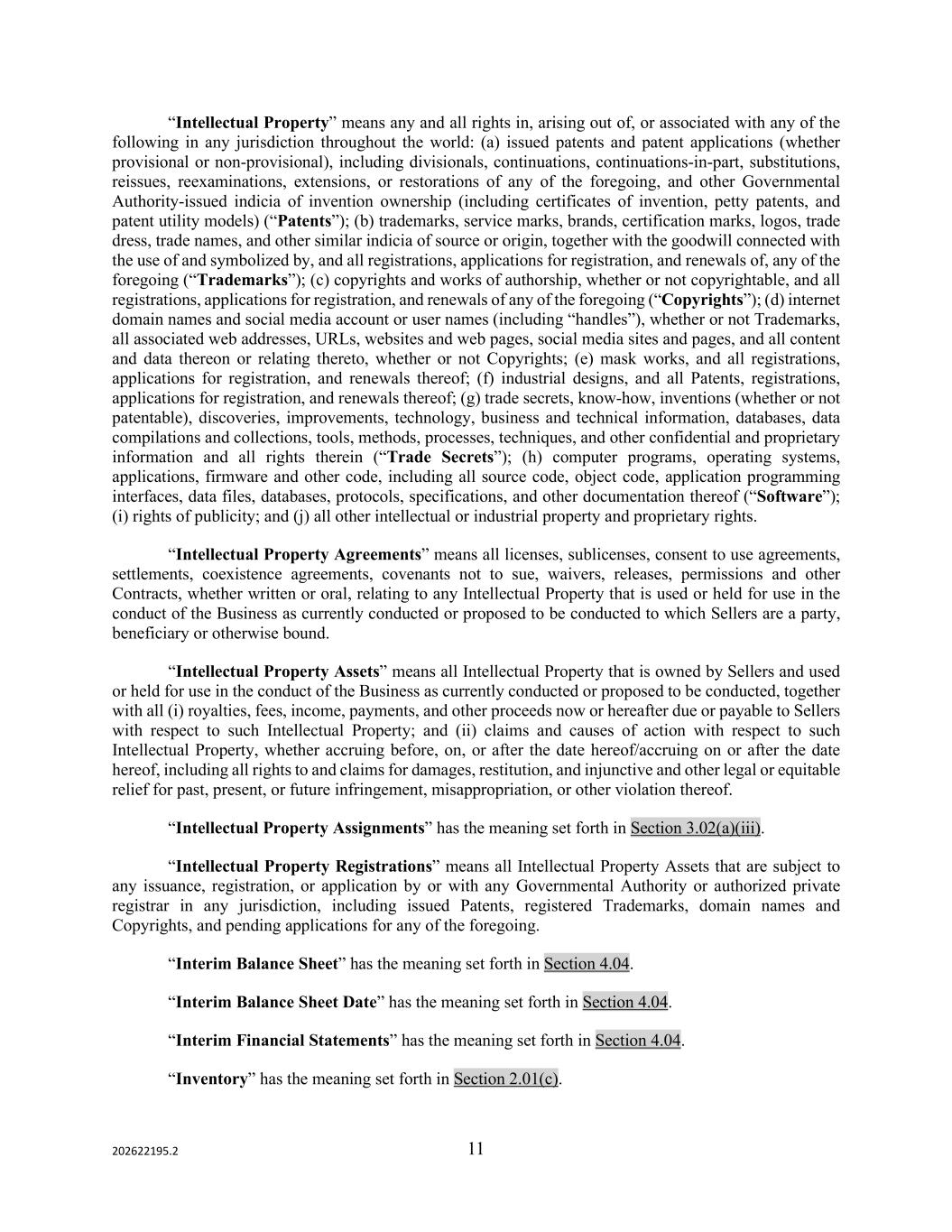 202622195.2 11 “Intellectual Property” means any and all rights in, arising out of, or associated with any of the following in any jurisdiction throughout the world: (a) issued patents and patent applications (whether provisional or non-provisional), including divisionals, continuations, continuations-in-part, substitutions, reissues, reexaminations, extensions, or restorations of any of the foregoing, and other Governmental Authority-issued indicia of invention ownership (including certificates of invention, petty patents, and patent utility models) (“Patents”); (b) trademarks, service marks, brands, certification marks, logos, trade dress, trade names, and other similar indicia of source or origin, together with the goodwill connected with the use of and symbolized by, and all registrations, applications for registration, and renewals of, any of the foregoing (“Trademarks”); (c) copyrights and works of authorship, whether or not copyrightable, and all registrations, applications for registration, and renewals of any of the foregoing (“Copyrights”); (d) internet domain names and social media account or user names (including “handles”), whether or not Trademarks, all associated web addresses, URLs, websites and web pages, social media sites and pages, and all content and data thereon or relating thereto, whether or not Copyrights; (e) mask works, and all registrations, applications for registration, and renewals thereof; (f) industrial designs, and all Patents, registrations, applications for registration, and renewals thereof; (g) trade secrets, know-how, inventions (whether or not patentable), discoveries, improvements, technology, business and technical information, databases, data compilations and collections, tools, methods, processes, techniques, and other confidential and proprietary information and all rights therein (“Trade Secrets”); (h) computer programs, operating systems, applications, firmware and other code, including all source code, object code, application programming interfaces, data files, databases, protocols, specifications, and other documentation thereof (“Software”); (i) rights of publicity; and (j) all other intellectual or industrial property and proprietary rights. “Intellectual Property Agreements” means all licenses, sublicenses, consent to use agreements, settlements, coexistence agreements, covenants not to sue, waivers, releases, permissions and other Contracts, whether written or oral, relating to any Intellectual Property that is used or held for use in the conduct of the Business as currently conducted or proposed to be conducted to which Sellers are a party, beneficiary or otherwise bound. “Intellectual Property Assets” means all Intellectual Property that is owned by Sellers and used or held for use in the conduct of the Business as currently conducted or proposed to be conducted, together with all (i) royalties, fees, income, payments, and other proceeds now or hereafter due or payable to Sellers with respect to such Intellectual Property; and (ii) claims and causes of action with respect to such Intellectual Property, whether accruing before, on, or after the date hereof/accruing on or after the date hereof, including all rights to and claims for damages, restitution, and injunctive and other legal or equitable relief for past, present, or future infringement, misappropriation, or other violation thereof. “Intellectual Property Assignments” has the meaning set forth in Section 3.02(a)(iii). “Intellectual Property Registrations” means all Intellectual Property Assets that are subject to any issuance, registration, or application by or with any Governmental Authority or authorized private registrar in any jurisdiction, including issued Patents, registered Trademarks, domain names and Copyrights, and pending applications for any of the foregoing. “Interim Balance Sheet” has the meaning set forth in Section 4.04. “Interim Balance Sheet Date” has the meaning set forth in Section 4.04. “Interim Financial Statements” has the meaning set forth in Section 4.04. “Inventory” has the meaning set forth in Section 2.01(c).