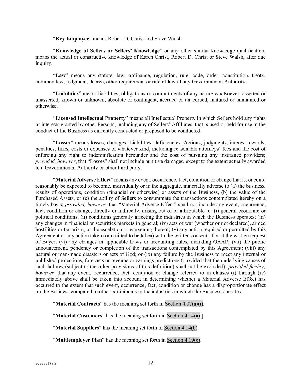 202622195.2 12 “Key Employee” means Robert D. Christ and Steve Walsh. “Knowledge of Sellers or Sellers’ Knowledge” or any other similar knowledge qualification, means the actual or constructive knowledge of Karen Christ, Robert D. Christ or Steve Walsh, after due inquiry. “Law” means any statute, law, ordinance, regulation, rule, code, order, constitution, treaty, common law, judgment, decree, other requirement or rule of law of any Governmental Authority. “Liabilities” means liabilities, obligations or commitments of any nature whatsoever, asserted or unasserted, known or unknown, absolute or contingent, accrued or unaccrued, matured or unmatured or otherwise. “Licensed Intellectual Property” means all Intellectual Property in which Sellers hold any rights or interests granted by other Persons, including any of Sellers’ Affiliates, that is used or held for use in the conduct of the Business as currently conducted or proposed to be conducted. “Losses” means losses, damages, Liabilities, deficiencies, Actions, judgments, interest, awards, penalties, fines, costs or expenses of whatever kind, including reasonable attorneys’ fees and the cost of enforcing any right to indemnification hereunder and the cost of pursuing any insurance providers; provided, however, that “Losses” shall not include punitive damages, except to the extent actually awarded to a Governmental Authority or other third party. “Material Adverse Effect” means any event, occurrence, fact, condition or change that is, or could reasonably be expected to become, individually or in the aggregate, materially adverse to (a) the business, results of operations, condition (financial or otherwise) or assets of the Business, (b) the value of the Purchased Assets, or (c) the ability of Sellers to consummate the transactions contemplated hereby on a timely basis; provided, however, that “Material Adverse Effect” shall not include any event, occurrence, fact, condition or change, directly or indirectly, arising out of or attributable to: (i) general economic or political conditions; (ii) conditions generally affecting the industries in which the Business operates; (iii) any changes in financial or securities markets in general; (iv) acts of war (whether or not declared), armed hostilities or terrorism, or the escalation or worsening thereof; (v) any action required or permitted by this Agreement or any action taken (or omitted to be taken) with the written consent of or at the written request of Buyer; (vi) any changes in applicable Laws or accounting rules, including GAAP; (vii) the public announcement, pendency or completion of the transactions contemplated by this Agreement; (viii) any natural or man-made disasters or acts of God; or (ix) any failure by the Business to meet any internal or published projections, forecasts or revenue or earnings predictions (provided that the underlying causes of such failures (subject to the other provisions of this definition) shall not be excluded); provided further, however, that any event, occurrence, fact, condition or change referred to in clauses (i) through (iv) immediately above shall be taken into account in determining whether a Material Adverse Effect has occurred to the extent that such event, occurrence, fact, condition or change has a disproportionate effect on the Business compared to other participants in the industries in which the Business operates. “Material Contracts” has the meaning set forth in Section 4.07(a)(i). “Material Customers” has the meaning set forth in Section 4.14(a).] “Material Suppliers” has the meaning set forth in Section 4.14(b). “Multiemployer Plan” has the meaning set forth in Section 4.19(c).