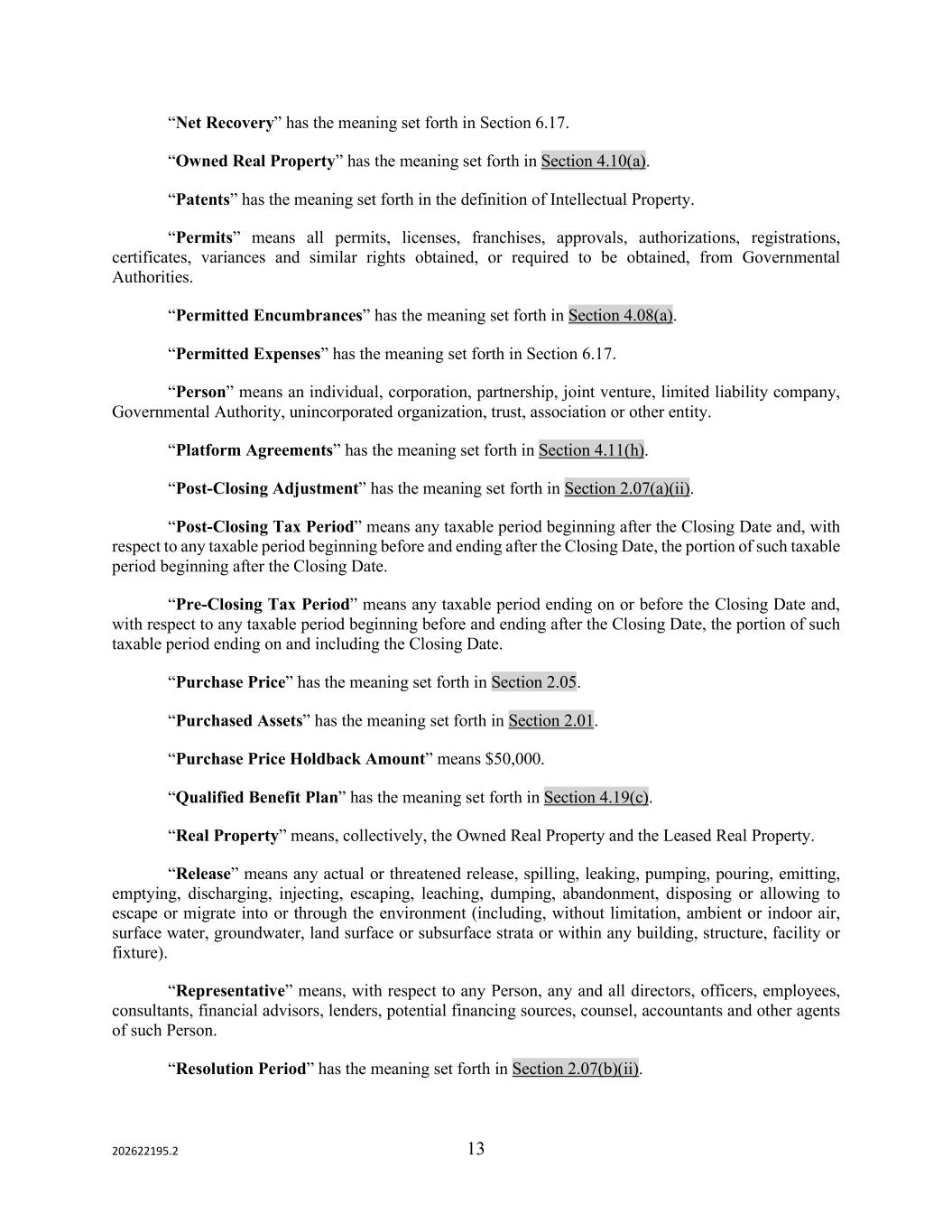 202622195.2 13 “Net Recovery” has the meaning set forth in Section 6.17. “Owned Real Property” has the meaning set forth in Section 4.10(a). “Patents” has the meaning set forth in the definition of Intellectual Property. “Permits” means all permits, licenses, franchises, approvals, authorizations, registrations, certificates, variances and similar rights obtained, or required to be obtained, from Governmental Authorities. “Permitted Encumbrances” has the meaning set forth in Section 4.08(a). “Permitted Expenses” has the meaning set forth in Section 6.17. “Person” means an individual, corporation, partnership, joint venture, limited liability company, Governmental Authority, unincorporated organization, trust, association or other entity. “Platform Agreements” has the meaning set forth in Section 4.11(h). “Post-Closing Adjustment” has the meaning set forth in Section 2.07(a)(ii). “Post-Closing Tax Period” means any taxable period beginning after the Closing Date and, with respect to any taxable period beginning before and ending after the Closing Date, the portion of such taxable period beginning after the Closing Date. “Pre-Closing Tax Period” means any taxable period ending on or before the Closing Date and, with respect to any taxable period beginning before and ending after the Closing Date, the portion of such taxable period ending on and including the Closing Date. “Purchase Price” has the meaning set forth in Section 2.05. “Purchased Assets” has the meaning set forth in Section 2.01. “Purchase Price Holdback Amount” means $50,000. “Qualified Benefit Plan” has the meaning set forth in Section 4.19(c). “Real Property” means, collectively, the Owned Real Property and the Leased Real Property. “Release” means any actual or threatened release, spilling, leaking, pumping, pouring, emitting, emptying, discharging, injecting, escaping, leaching, dumping, abandonment, disposing or allowing to escape or migrate into or through the environment (including, without limitation, ambient or indoor air, surface water, groundwater, land surface or subsurface strata or within any building, structure, facility or fixture). “Representative” means, with respect to any Person, any and all directors, officers, employees, consultants, financial advisors, lenders, potential financing sources, counsel, accountants and other agents of such Person. “Resolution Period” has the meaning set forth in Section 2.07(b)(ii).