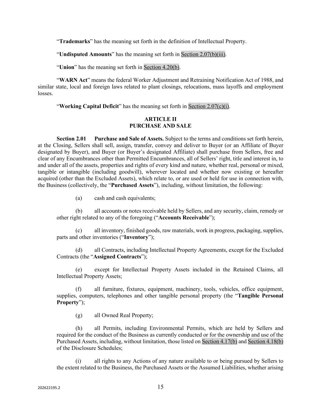 202622195.2 15 “Trademarks” has the meaning set forth in the definition of Intellectual Property. “Undisputed Amounts” has the meaning set forth in Section 2.07(b)(iii). “Union” has the meaning set forth in Section 4.20(b). “WARN Act” means the federal Worker Adjustment and Retraining Notification Act of 1988, and similar state, local and foreign laws related to plant closings, relocations, mass layoffs and employment losses. “Working Capital Deficit” has the meaning set forth in Section 2.07(c)(i). ARTICLE II PURCHASE AND SALE Section 2.01 Purchase and Sale of Assets. Subject to the terms and conditions set forth herein, at the Closing, Sellers shall sell, assign, transfer, convey and deliver to Buyer (or an Affiliate of Buyer designated by Buyer), and Buyer (or Buyer’s designated Affiliate) shall purchase from Sellers, free and clear of any Encumbrances other than Permitted Encumbrances, all of Sellers’ right, title and interest in, to and under all of the assets, properties and rights of every kind and nature, whether real, personal or mixed, tangible or intangible (including goodwill), wherever located and whether now existing or hereafter acquired (other than the Excluded Assets), which relate to, or are used or held for use in connection with, the Business (collectively, the “Purchased Assets”), including, without limitation, the following: (a) cash and cash equivalents; (b) all accounts or notes receivable held by Sellers, and any security, claim, remedy or other right related to any of the foregoing (“Accounts Receivable”); (c) all inventory, finished goods, raw materials, work in progress, packaging, supplies, parts and other inventories (“Inventory”); (d) all Contracts, including Intellectual Property Agreements, except for the Excluded Contracts (the “Assigned Contracts”); (e) except for Intellectual Property Assets included in the Retained Claims, all Intellectual Property Assets; (f) all furniture, fixtures, equipment, machinery, tools, vehicles, office equipment, supplies, computers, telephones and other tangible personal property (the “Tangible Personal Property”); (g) all Owned Real Property; (h) all Permits, including Environmental Permits, which are held by Sellers and required for the conduct of the Business as currently conducted or for the ownership and use of the Purchased Assets, including, without limitation, those listed on Section 4.17(b) and Section 4.18(b) of the Disclosure Schedules; (i) all rights to any Actions of any nature available to or being pursued by Sellers to the extent related to the Business, the Purchased Assets or the Assumed Liabilities, whether arising